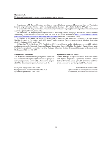 12. Березина Ю.В., Байкова О.В., Скурихина О.В. Лингвистический анализ лексико-грамматических ошибок машинного перевода // Наука. Образование. Общество: тенденции и перспективы развития: сб. материалов Междунар. науч.-практ. конф. Чебоксары, 2020. С. 196-197. EDN: NMHUQG