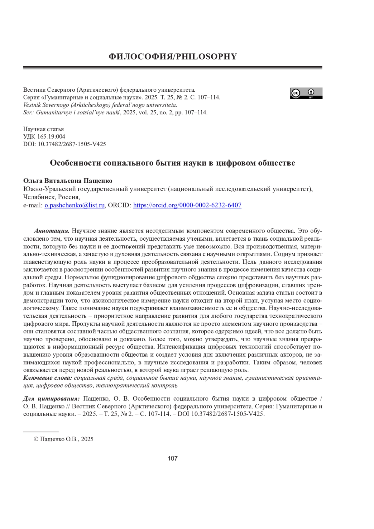 Наука в цифровом обществе пред- ставляет собой сложный социальный феномен, пронизывающий все сферы общественной деятельности. Воспринимаемая как когнитивносоциальная деятельность, наука является предметом комплексного изучения и пристального внимания начиная с ХХ века, когда вектор ее направленности переменился в сторону преобразовательной деятельности в соответствии с общественным запросом. Актуальность темы обусловлена прежде всего возрастающей ролью науки в формирующемся цифровом обществе.