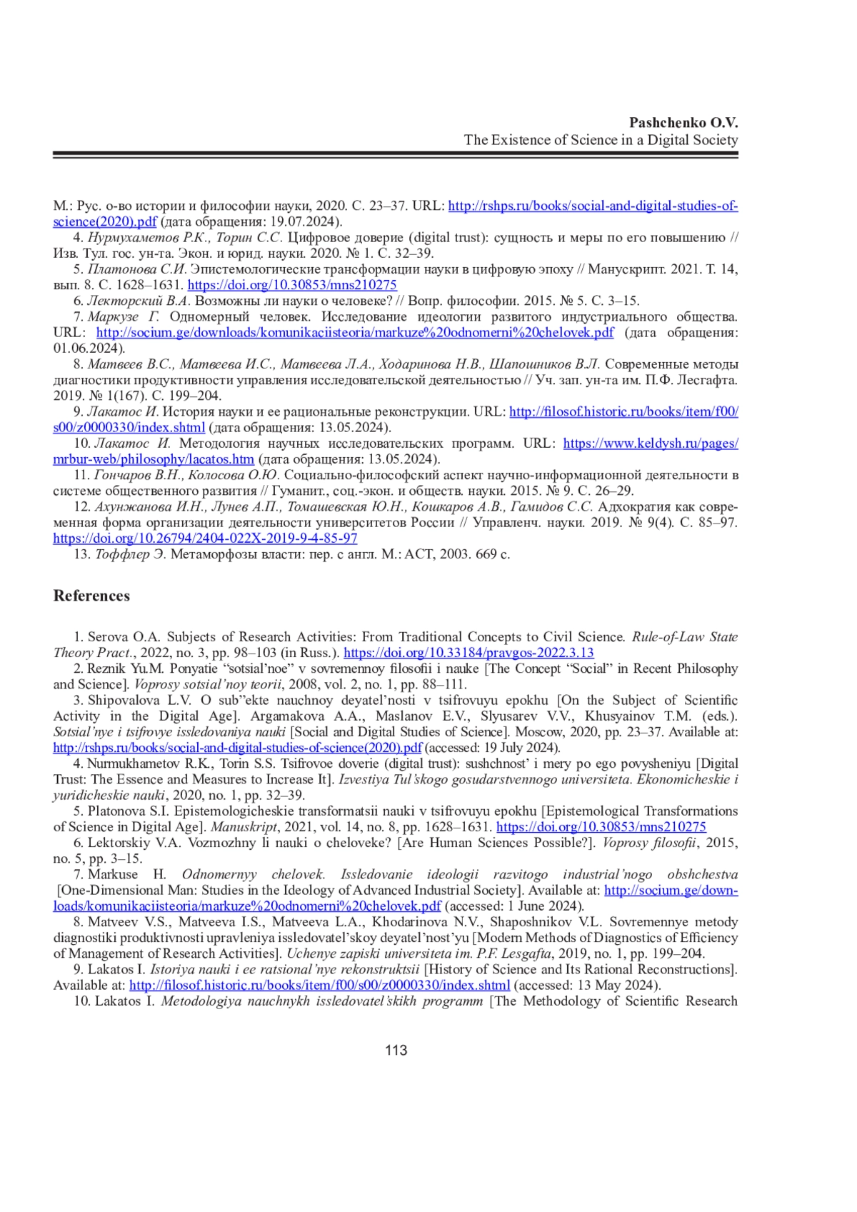 1. Серова О.А. Субъекты научно-исследовательской деятельности: от традиционных представлений к гражданской науке // Правовое гос-во: теория и практика. 2022. No 3. С. 98-103. DOI: 10.33184/pravgos-2022.3.13 EDN: HVPLLP