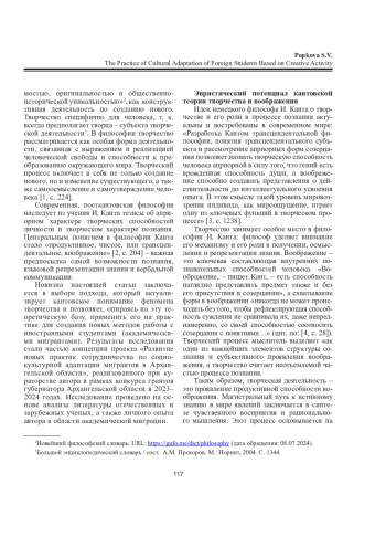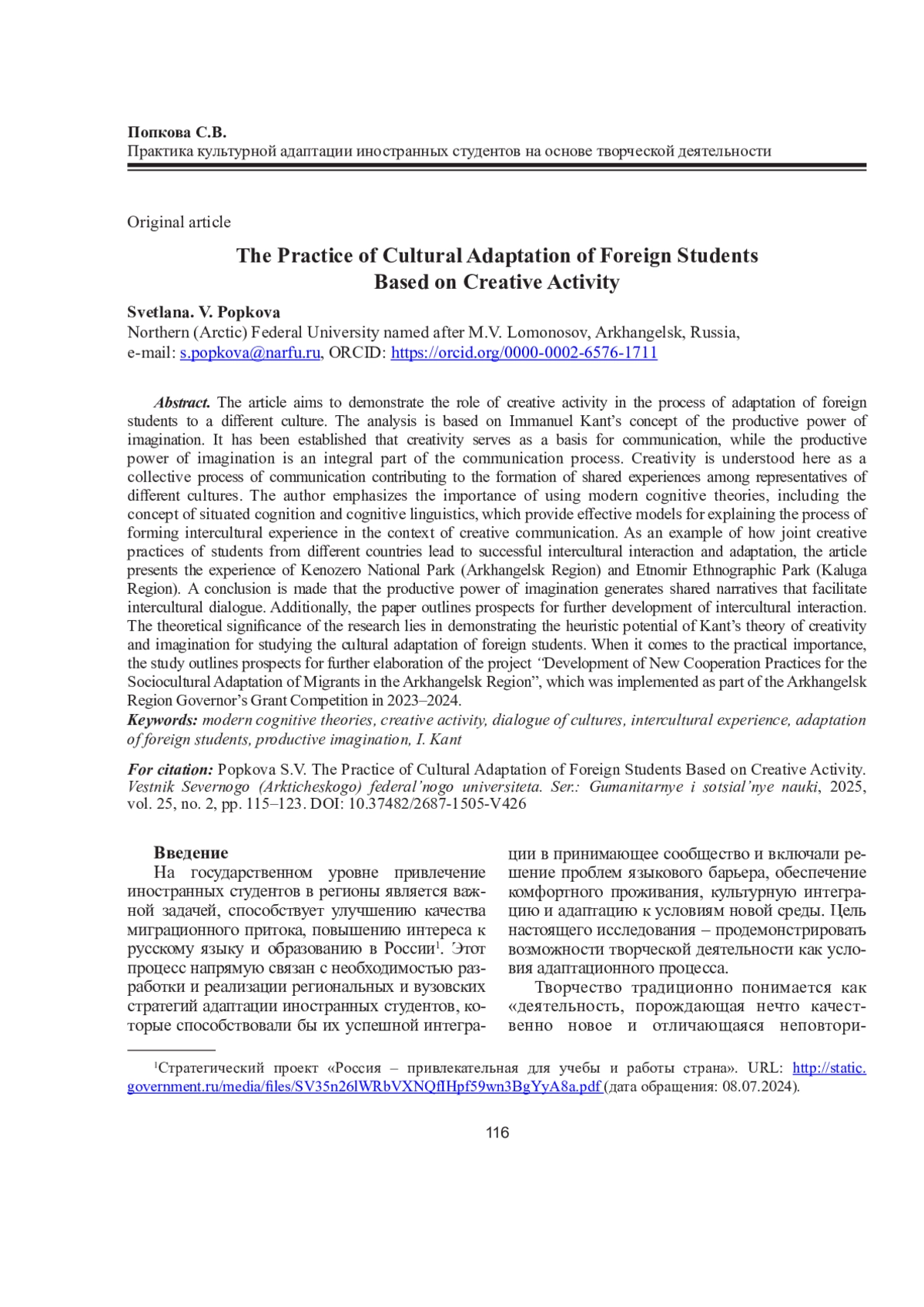 В статье поставлена цель продемонстрировать роль творческой деятельности в процессе адаптации иностранных студентов к другой культуре. Анализ строится вокруг понятия продуктивной способности воображения И. Канта. Установлено, что творчество выступает фундаментальной основой коммуникации, а продуктивная способность воображения - неотъемлемой частью процесса коммуникации. Творчество понимается как коллективный процесс коммуникации, способствующий формированию общего для представителей разных культур опыта. Автор акцентирует внимание на значимости применения современных когнитивных теорий, включая концепцию ситуационного познания и когнитивную лингвистику, предоставляющие эффективные модели для объяснения процесса формирования межкультурного опыта в условиях творческой коммуникации. В качестве примера, в котором совместные творческие практики студентов из разных стран приводят к успешному межкультурному взаимодействию и адаптации к другой культуре, приведен опыт работы Кенозерского национального парка (Архангельская область) и этнографического парка «Этномир» (Калужская область). В заключение сделан вывод, что продуктивная способность воображения обусловливает создание общих смыслов, обеспечивающих диалог культур, и обозначены перспективы дальнейшей реализации заявленного взаимодействия. Теоретическая значимость статьи заключается в том, что показан эвристический потенциал кантовской теории творчества и воображения в исследовании практики культурной адаптации иностранных студентов. Практическая значимость состоит в том, что обозначены перспективы дальнейшей разработки проекта «Развитие новых практик сотрудничества по социокультурной адаптации мигрантов в Архангельской области», который был реализован в рамках конкурса грантов губернатора Архангельской области в 2023-2024 годах.
