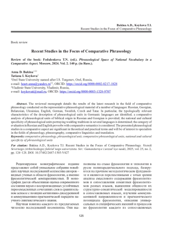 В рецензируемой монографии подробно освещаются результаты новейших исследований в области сопоставительной фразеологии, проведенных на репрезентативном фразеологическом материале ряда языков: русского, грузинского, белорусского, украинского, английского, немецкого, шведского, чешского, татарского. В частности, выявлены типологически релевантные характеристики описания фразеологических единиц на примере германских языков; представлен сопоставительный анализ фразеологических единиц библейской этимологии в русском и грузинском языках; определена национально-культурная специфика фразеологизмов, описывающих свадебные традиции в нескольких языках; рассмотрена категория оценки в русских и английских пословицах с компаративной семантикой. Фразеологические исследования в сопоставительном аспекте являются значимыми в теоретическом и практическом плане, адресованы специалистам в области фразеологии, фразеографии, сопоставительного языкознания и перевода.