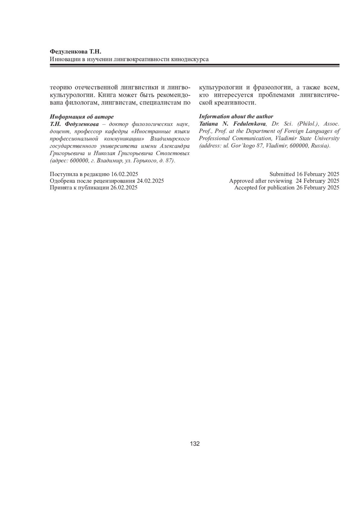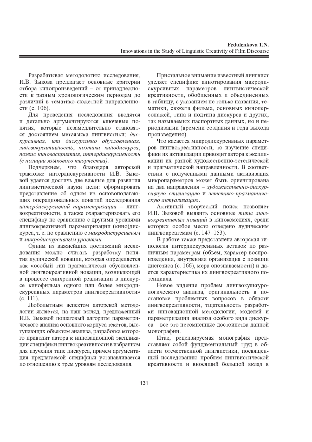 В рецензии дается высокая оценка полной новаторских идей монографии, авторы которой делятся опытом изучения лингвокреативности в кинодискурсе. С целью проведения такого исследования известный лингвист И. В. Зыкова разработала инновационный метод дискурсивно-параметрического анализа. Создание названного апробированного метода сопровождалось появлением специального понятийно-терминологического инструментария. Результаты проведенного исследования раскрывают многоступенчатость процесса креативного моделирования вербальной системы кинодискурса, перспективность применения которого в лингвистических штудиях не подлежит сомнению.