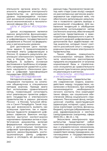 В статье рассматриваются процессы развития электронного правительства и цифровой трансформации государственного управления в России. Особое внимание уделено сравнительному анализу региональных практик, в частности опыта Москвы, Тулы и Санкт-Петербурга, где были достигнуты различные результаты в области цифровой зрелости. Методологическая основа исследования включает сравнительный и системный анализ, метод кейс-стади, а также контент-анализ нормативно-правовой базы и стратегических документов. Такой подход позволил выявить достижения регионов, проблемы внедрения цифровых сервисов, а также барьеры, связанные с дефицитом ИТ-специалистов, ограниченной инфраструктурой и неоднородным уровнем цифровой грамотности населения. В работе уточнена роль федеральных и региональных программ в формировании цифровой среды, показано завершение национального проекта «Цифровая экономика» (2019-2024 гг.) и обозначены перспективы реализации нового проекта «Экономика данных и цифровая трансформация государства» (2025-2030 гг.). Научная новизна статьи заключается в сопоставительном региональном анализе, выявлении лучших практик цифровизации и определении факторов, препятствующих дальнейшему развитию. Сделан вывод о необходимости интеграции региональных инициатив в федеральные программы, а также о значении человекоцентричного подхода, предполагающего удобство, доступность и открытость цифровых сервисов для всех категорий граждан.