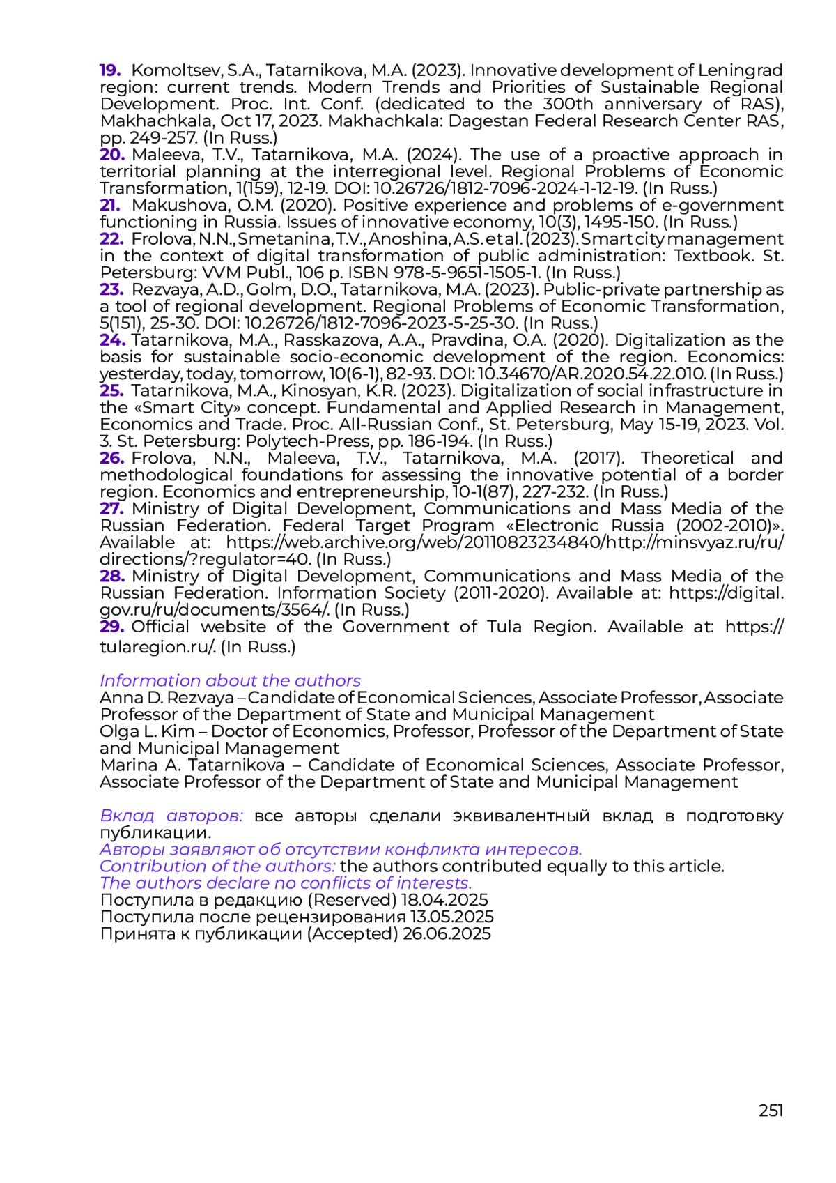 20. Малеева Т.В., Татарникова М.А. Использование проактивного подхода в территориальном планировании на межрегиональном уровне // Региональные проблемы преобразования экономики, 2024. № 1(159). С. 12-19. DOI: 10.26726/1812-7096-2024-1-12-19 EDN: KRLJXH