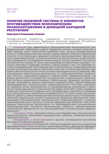 Для эффективного противодействия экономическим правонарушениям необходима работа правовой системы, которая включает в себя, прежде всего, нормативно-правовые акты, органы государственной власти и правоохранительные органы. Целью работы является определение понятия и составляющих правовой системы противодействия экономическим правонарушениям, а также выяснения её региональных особенностей. При проведении исследования использованы: методы научного познания и эмпирические методы. В статье рассматриваются различные подходы к понимаю категории «правовая система». Сделан вывод о том, что правовая система, определяющая противодействие экономическим правонарушениям, состоит из четырёх основных элементов, таких как: системы нормативно-правового обеспечения (в том числе системы законодательства); субъектов, обеспечивающих практическую деятельность по правоприменению предписаний системы нормативно-правового обеспечения; правоприменения как формы деятельности государства, направленной на реализацию предписаний системы нормативно-правового обеспечения; правовой культуры общества. Проводится анализ нормативно-правовой базы, обеспечивающей противодействие экономическим правонарушениям. Комплекс нормативно-правовых актов, направленных на предотвращение, выявление и пресечение правонарушений в экономической сфере включает в себя: кодифицированные нормативно-правовые акты; федеральные нормативно-правовые акты; региональные нормативно-правовые акты. В статье также рассматриваются субъекты, обеспечивающие практическую деятельность по правоприменению предписаний системы нормативно-правового обеспечения, определяющей противодействие экономическим правонарушениям, а именно: правоохранительные органы; основные федеральные субъекты, обеспечивающие практическую деятельность по противодействию экономическим правонарушениям; основные региональные субъекты, обеспечивающие практическую деятельность по противодействию экономическим правонарушениям.