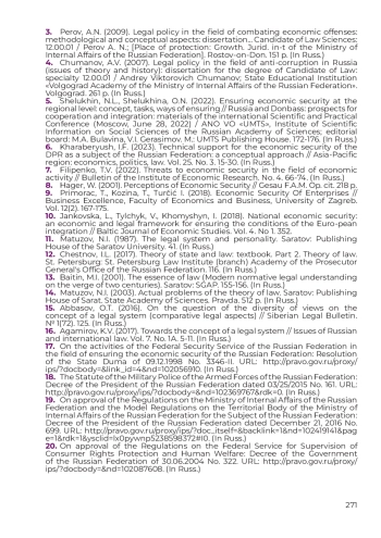 6. Хараберюш И.Ф. Техническое обеспечение экономической безопасности ДНР как субъекта Российской Федерации: концептуальный подход // Азиатско-Тихоокеанский регион: экономика, политика, право, 2023. Т. 25. № 3. С. 15-30.
