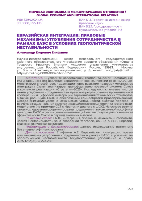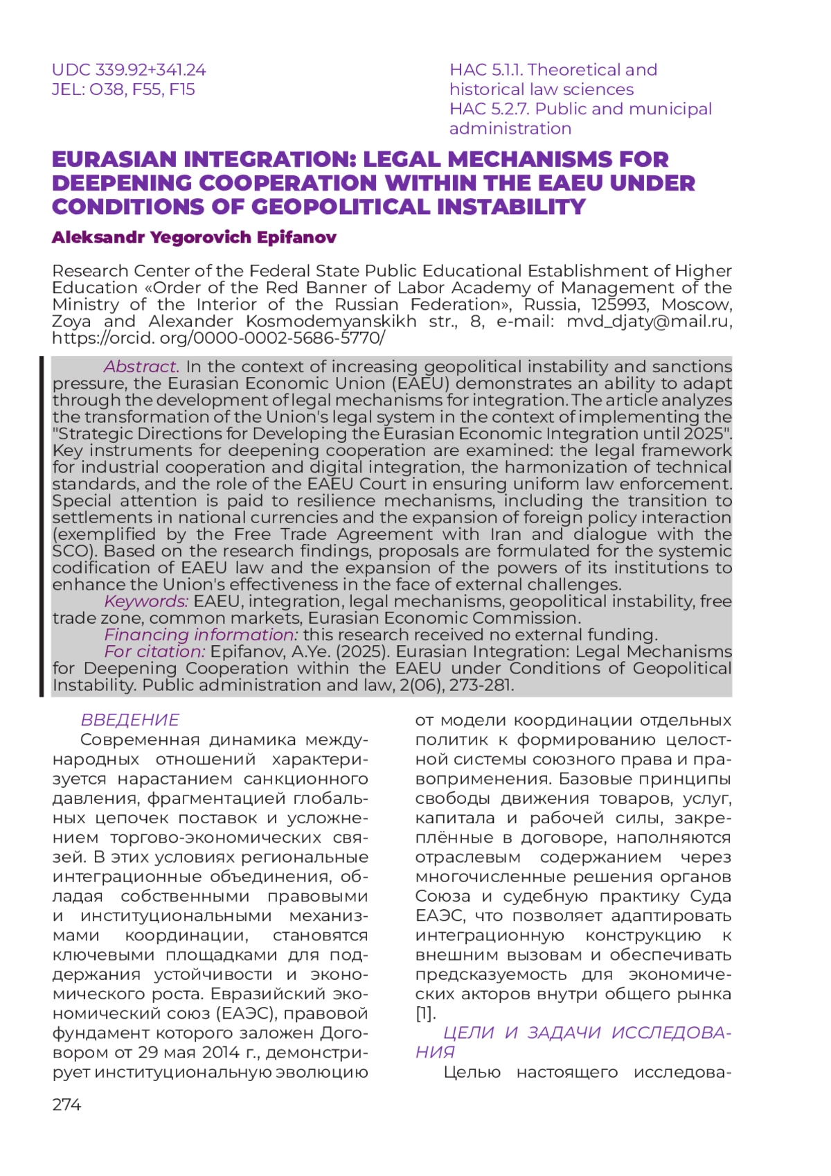 В условиях нарастающей геополитической нестабильности и санкционного давления Евразийский экономический союз (ЕАЭС) демонстрирует способность к адаптации через развитие правовых механизмов интеграции. Статья анализирует трансформацию правовой системы Союза в контексте реализации «Стратегии-2025». Исследуются ключевые инструменты углубления сотрудничества: правовое регулирование промышленной кооперации и цифровой интеграции, гармонизация технических стандартов, а также роль Суда ЕАЭС в обеспечении единообразия правоприменения. Особое внимание уделено механизмам устойчивости, включая переход на расчёты в национальных валютах и расширение внешнеполитического взаимодействия (на примере ССТ с Ираном и диалога с ШОС). На основе результатов исследования сформулированы предложения по системной кодификации права ЕАЭС и расширению компетенций его институтов для повышения эффективности Союза в период внешних вызовов.