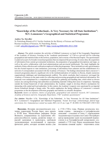 В статье рассматривается деятельность М. В. Ломоносова на посту главы Географического департамента Академии наук. Центральное место в исследовании отведено «академической анкете» 1760 года как ключевому инструменту сбора географо-статистических сведений о территории, населении и хозяйстве Российской империи. Анкета выступала частью более широкой исследовательской программы, включавшей обработку данных ревизий, привлечение информации из центральных государственных ведомств, составление географических описаний и карт, а также активное взаимодействие с местными администрациями и провинциальными интеллектуалами. Особое внимание в работе уделено методам сбора и проверки данных, полученных помимо анкетирования путем запросов в государственные учреждения, обработки сведений из писцовых книг и формирования сети корреспондентов Академии наук. Показано, что исследовательская программа М. В. Ломоносова способствовала институционализации статистики в России, несмотря на организационные трудности и межведомственные разногласия. Сделан вывод, что ученый видел Академию наук главным центром сбора и обработки географо-статистических сведений. В основе предложений М. В. Ломоносова лежал комплексный подход к формированию массива данных, которые он предполагал получать из разных источников. Основными среди них были государственные органы власти, где в ходе управленческой практики накапливались те или иные материалы в зависимости от сферы компетенции. Не будучи встроенной в систему государственного управления, Академия наук искала наиболее эффективные формы взаимодействия с центральными и местными органами власти. В этих условиях формальным основанием для академических запросов стало исполнение высочайшего повеления, оформленного указом Сената. В статье особо подчеркнуто влияние исследовательской программы М. В. Ломоносова на развитие отечественной географии и статистики.