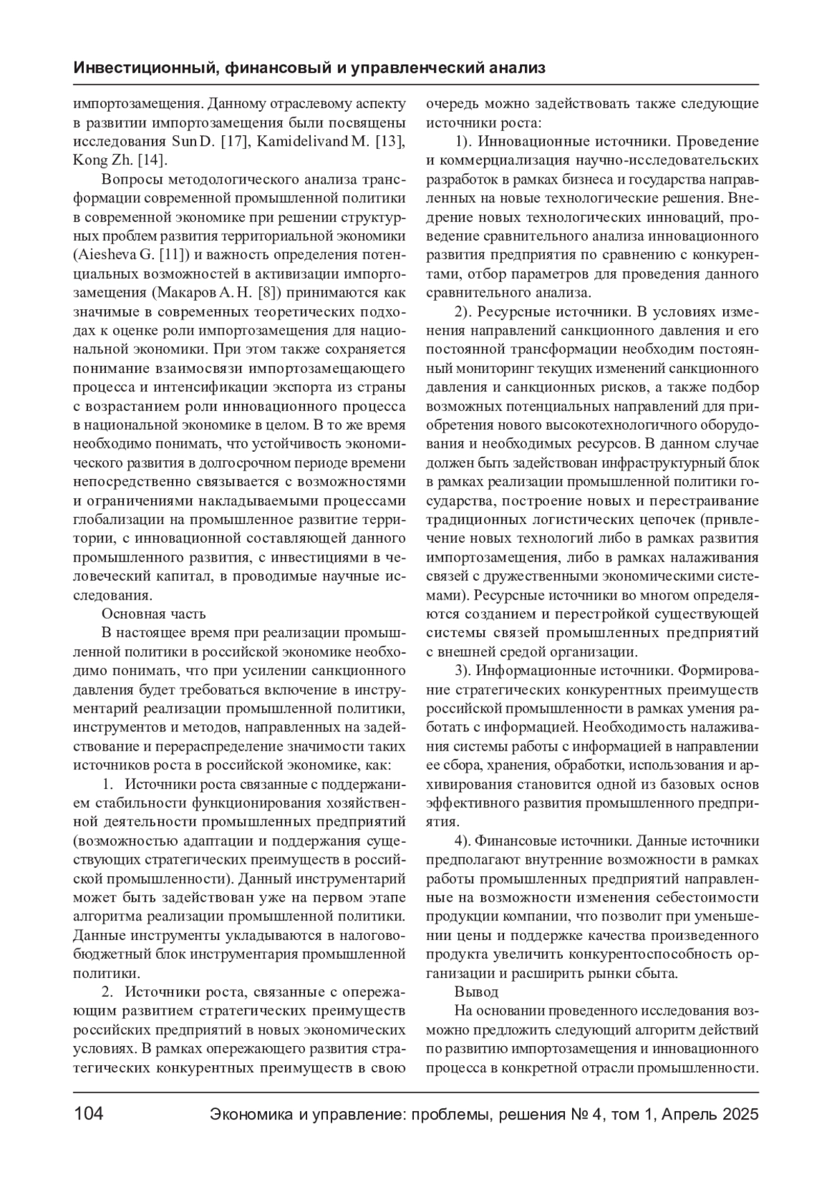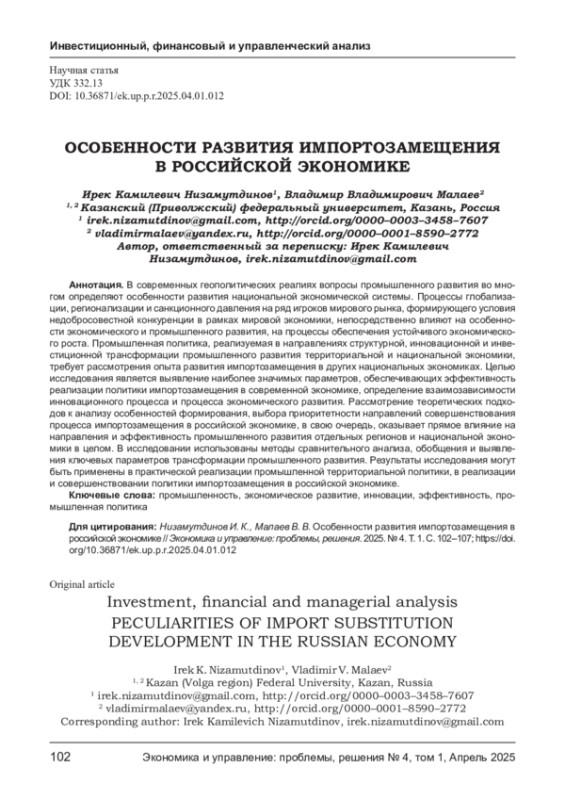 В современных геополитических условиях формирование и совершенствование импортозамещения становится важным фактором общего экономического и промышленного развития национальной экономики.