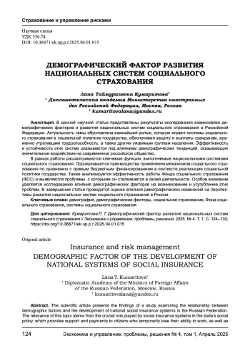 В данной научной статье представлены результаты исследования взаимосвязи демографических факторов и развития национальных систем социального страхования в Российской Федерации. Актуальность темы обусловлена важнейшей ролью, которую играют системы социального страхования в социальной политике государства, обеспечивая защиту и выплаты гражданам, временно утратившим трудоспособность, а также другим уязвимым группам населения. Эффективность и устойчивость этих систем оказываются под влиянием демографических тенденций, оказывающих значительное воздействие на современное российское общество. В рамках работы рассматриваются ключевые функции, выполняемые национальными системами социального страхования. Подчеркиваются преимущества применения механизмов социального страхования по сравнению с прямым бюджетным финансированием в контексте реализации социальной политики государства. Также анализируется эффективность работы Фонда социального страхования (ФСС) и выявляются проблемы, с которыми он сталкивается в своей деятельности. Особое внимание уделяется исследованию влияния демографических факторов на возникновение и усугубление этих проблем. В завершение статьи проводится оценка влияния демографических изменений на перспективы развития национальных систем социального страхования в России.