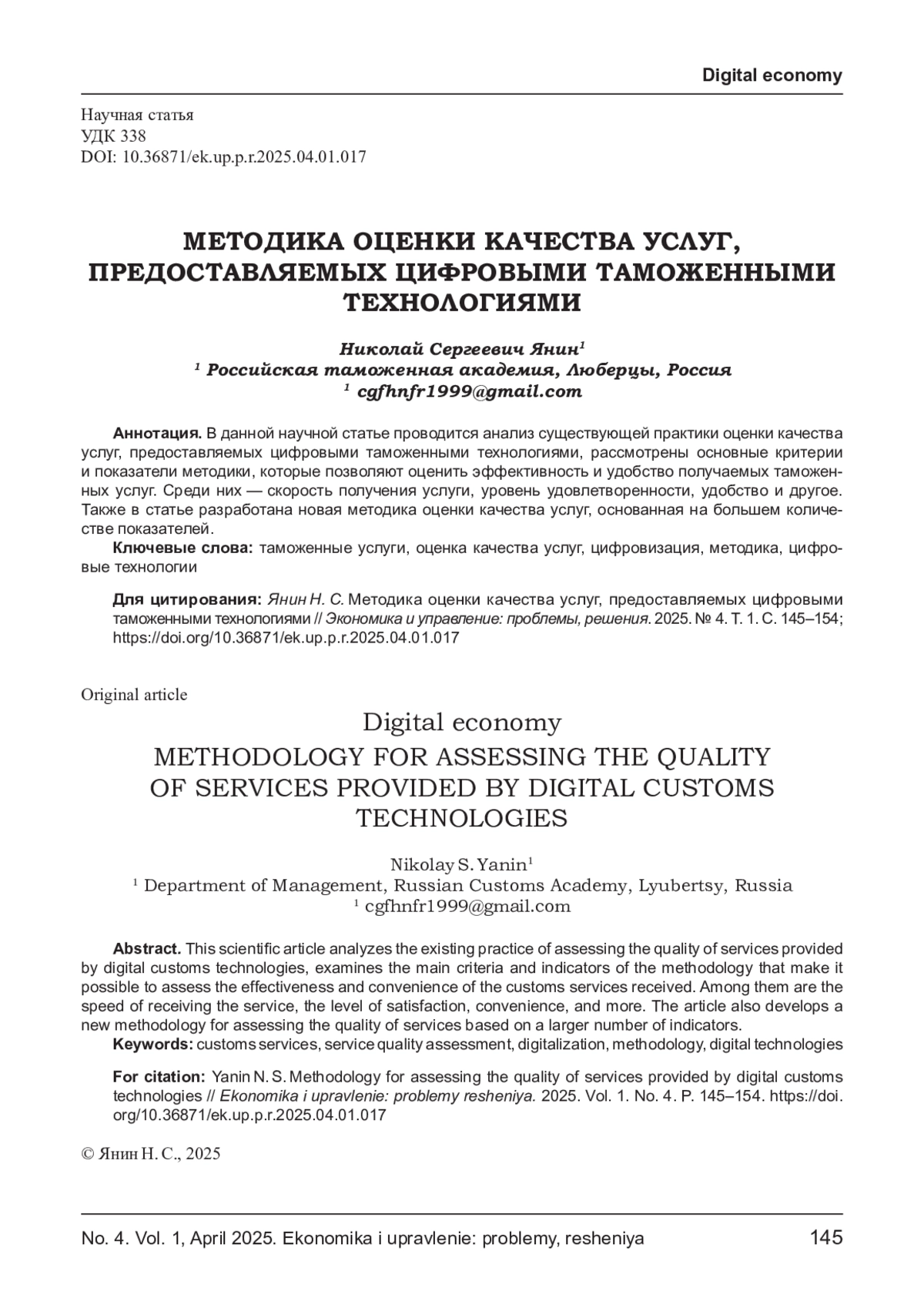 В данной научной статье проводится анализ существующей практики оценки качества услуг, предоставляемых цифровыми таможенными технологиями, рассмотрены основные критерии и показатели методики, которые позволяют оценить эффективность и удобство получаемых таможенных услуг. Среди них - скорость получения услуги, уровень удовлетворенности, удобство и другое. Также в статье разработана новая методика оценки качества услуг, основанная на большем количестве показателей.