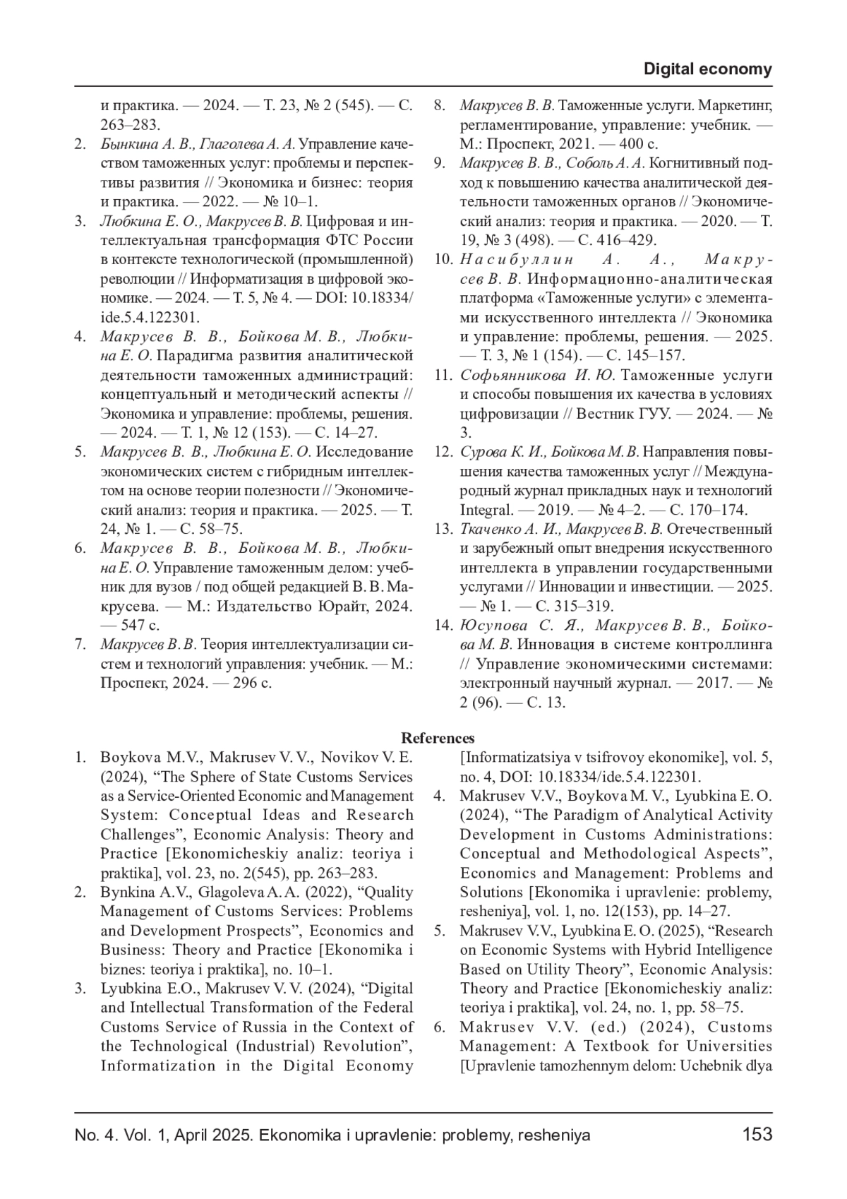 4. Макрусев В. В., Бойкова М. В., Любкина Е. О. Парадигма развития аналитической деятельности таможенных администраций: концептуальный и методический аспекты // Экономика и управление: проблемы, решения. - 2024. - Т. 1, № 12 (153). - С. 14-27. EDN: EGZNCP