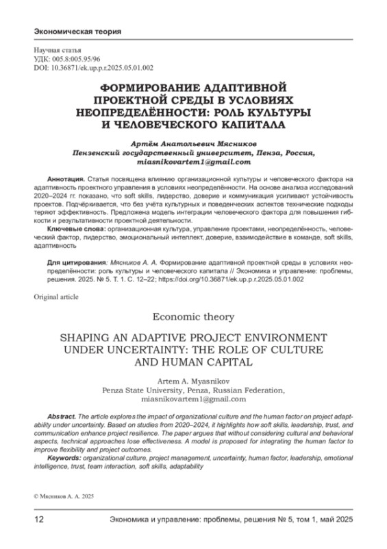 Статья посвящена влиянию организационной культуры и человеческого фактора на адаптивность проектного управления в условиях неопределённости. На основе анализа исследований 2020-2024 гг. показано, что soft skills, лидерство, доверие и коммуникация усиливают устойчивость проектов. Подчёркивается, что без учёта культурных и поведенческих аспектов технические подходы теряют эффективность. Предложена модель интеграции человеческого фактора для повышения гибкости и результативности проектной деятельности.