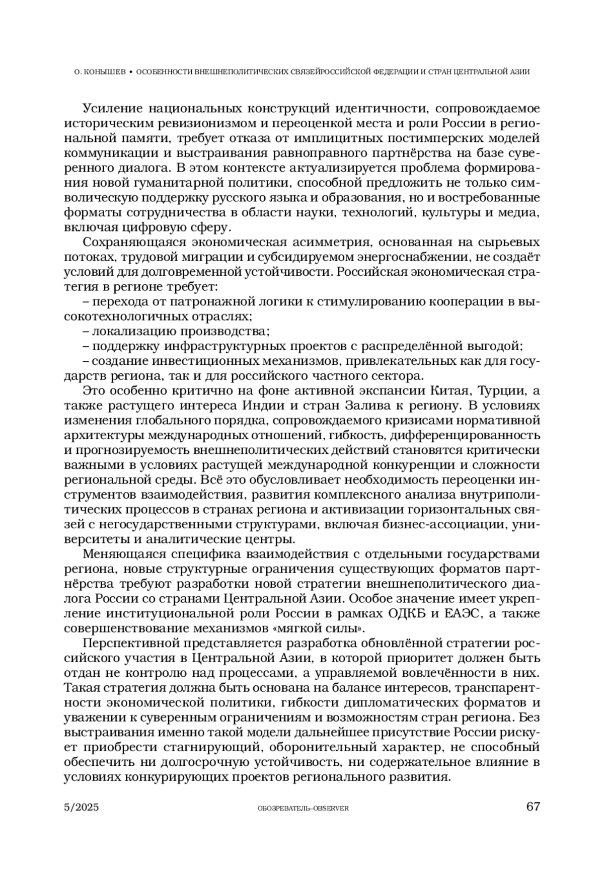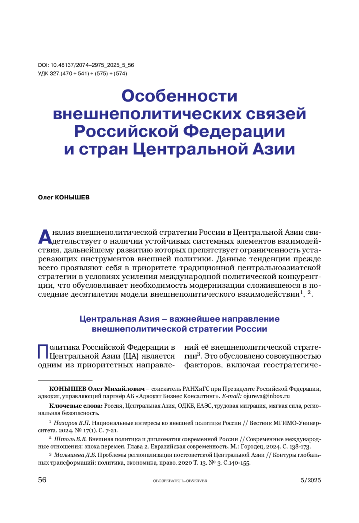 Страны Центральной Азии, в частности, Казахстан, Узбекистан, Киргизия, Таджикистан и Туркменистан, характеризуются высоким уровнем политической, социально-экономической и этноконфессиональной неоднородности, что требует от России дифференцированного подхода к формированию политики двустороннего и многостороннего взаимодействия.