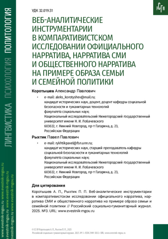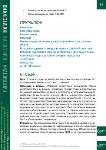 Процедура и методы. Методика применения веб-аналитического инструментария в рамках социально-политических исследований феноменов массового сознания и технологий их формирования рассматривается на примере анализа сферы ценностного нарратива. Семантической темой веб-аналитического мониторинга в статье выступает сфера государственной семейной политики и её отражение в эмпирических показателях сетевой активности пользователей в русскоязычном пространстве сети Интернет. Для построения выводов об уровне общественного интереса вводится понятие «эмпирические показатели сетевого нарратива» как дискурсивной суммы трёх групп веб-аналитических показателей: официального нарратива, нарратива СМИ и общественного нарратива.