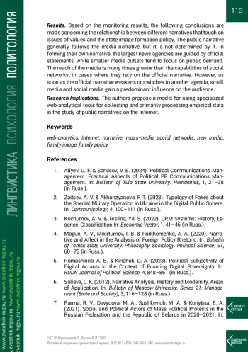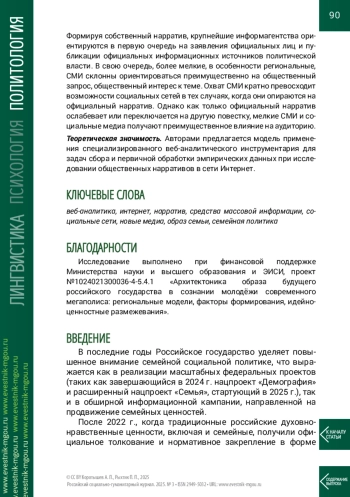 Постепенно складывается практика, когда исследования проблем политического нарратива строятся на базе анализа не только нормативных актов, выступлений официальных лиц и материалов СМИ классического формата, но и «новых медиа» [8, с. 30].