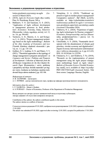 10. Чуланова О. Л., Глухова Т. Ю. Исследование реализации проектного управления с использованием методологии гибкого управления проектами на основе ценностей Agile // Вестник Евразийской науки, 2019. № 4. URL: https://esj.today/PDF/15ECVN419.pdf (доступ свободный). Загл. с экрана. Яз. рус., англ.