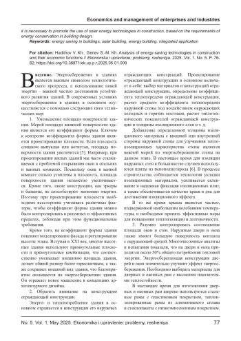 Энергосбережение в зданиях - это технология, которая отражает прогресс страны и является важным символом ее развития. Использование новой энергии является важной частью достижения устойчивого развития зданий. В данной статье анализируется и обсуждается энергосбережение зданий, а также продвижение и применение технологий солнечной энергетики в строительстве. Энергосбережение в зданиях стало серьезной проблемой, вызывающей все большую озабоченность. Современное общество крайне обеспокоено энергопотреблением строительных объектов и долгосрочным энергопотреблением зданий в процессе эксплуатации. Поэтому необходимо содействовать применению технологий солнечной энергетики в строительстве, исходя из требований энергосбережения при проектировании зданий.