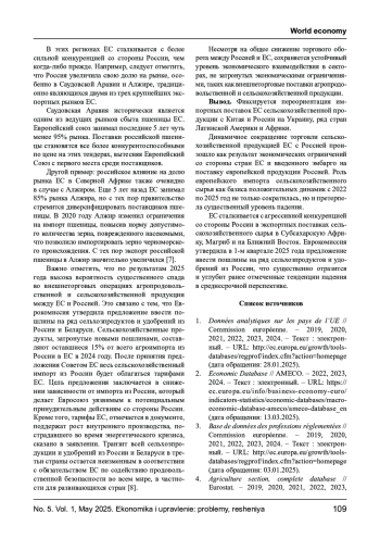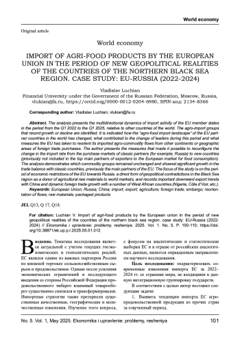 В ходе анализа представлены разнонаправленные динамики импортной деятельность стран-членов ЕС, в период с 1 квартала 2022 по 1 квартал 2025 года, относительно иных государств мира. Определены агроимпортные товарные группы, которые фиксируют рост или падение. Обозначено, как изменился «агроимпортный ландшафт» стран партнеров ЕС в мире, что способствовало смене лидеров за этот период и какие меры предпринял ЕС для переориентации своих импортных агропродовольственных товарных потоков с иных континентов или географических ареалов внешнеторгового закупа. Автором представлено, за счет каких мер удалось перенастроить смену импортного курса с рынков закупа классических партнеров (например, России) на новые государства (ранее не входившие в топ основных партнеров экспортеров на европейский рынок потребления продовольственной продукции). Анализ демонстрирует, какие товарные группы остались незыблемы и показали существенный рост в торговом балансе с классическими странами, ранее основными партнёрами ЕС. Фокус исследования акцентирован на период экономических ограничений ЕС в отношении России, прямой формы геополитических противоречий в черноморском регионе как доноре сельскохозяйственного сырья на мировые рынки, а также фиксирует важные снисходящие экспортные тренды с Китаем и динамичный внешнеторговый рост с рядом государств западной Африки (Нигерия, Кот-д`Вуар и др.).