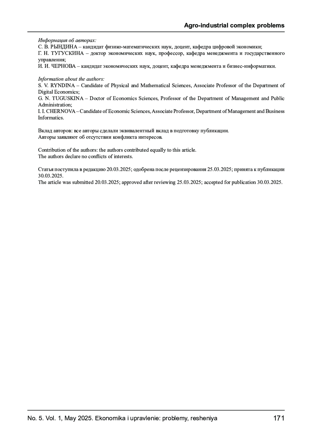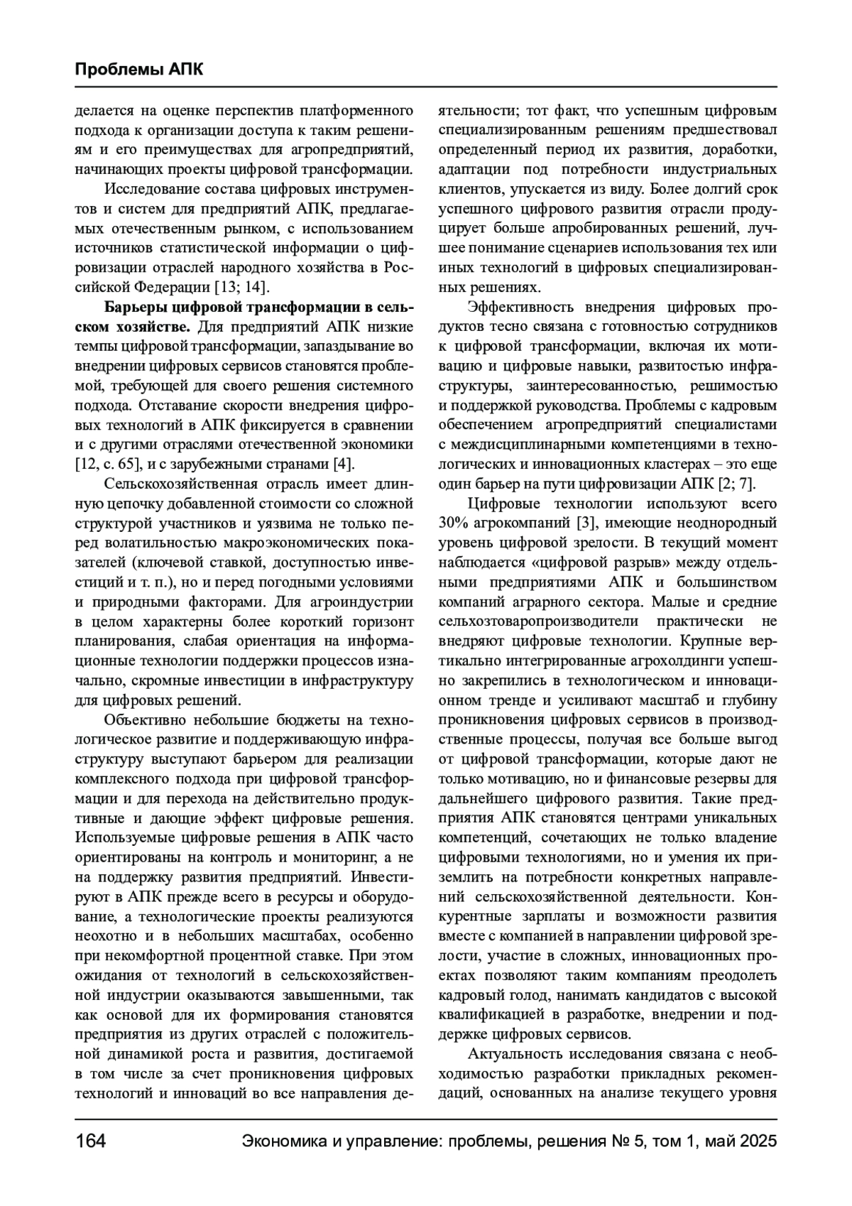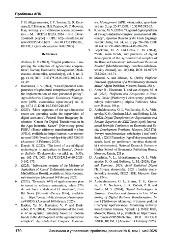 9. Лепехина Ю. А. Состояние, основные тренды и проблемы цифрового развития агропромышленного комплекса Российской Федерации / Ю. А. Лепехина, Е. Ю. Грасс // Международный научно-исследовательский журнал. 2024. № 10(148). 10.60797/ IRJ.2024.148.71. DOI: 10.60797/IRJ.2024.148.71 EDN: CDTKRV