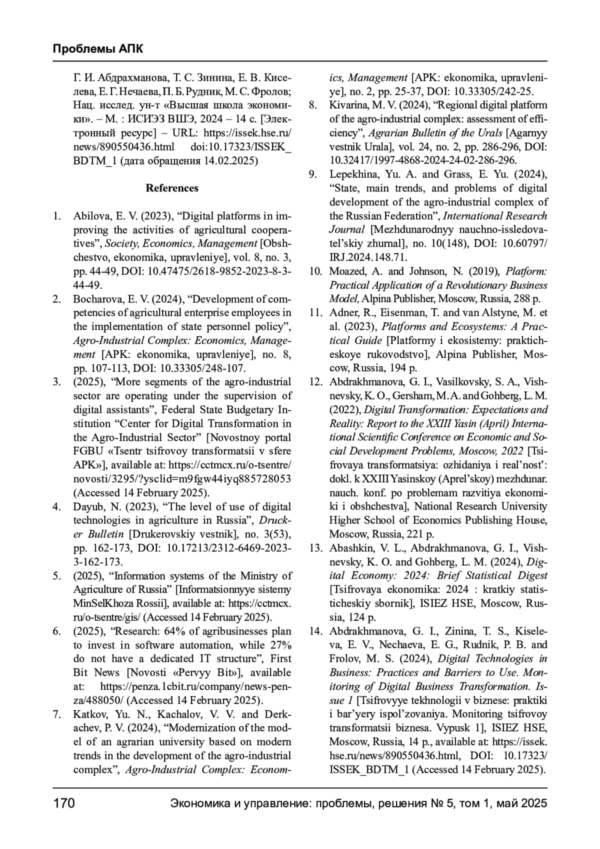 1. Абилова Е. В. Цифровые платформы в совершенствовании деятельности сельскохозяйственной кооперации / Е. В. Абилова // Общество, экономика, управление. 2023. Т. 8. № 3. С. 44-49. DOI: 10.47475/2618-9852-20238-3-44-49 EDN: ALGVVA