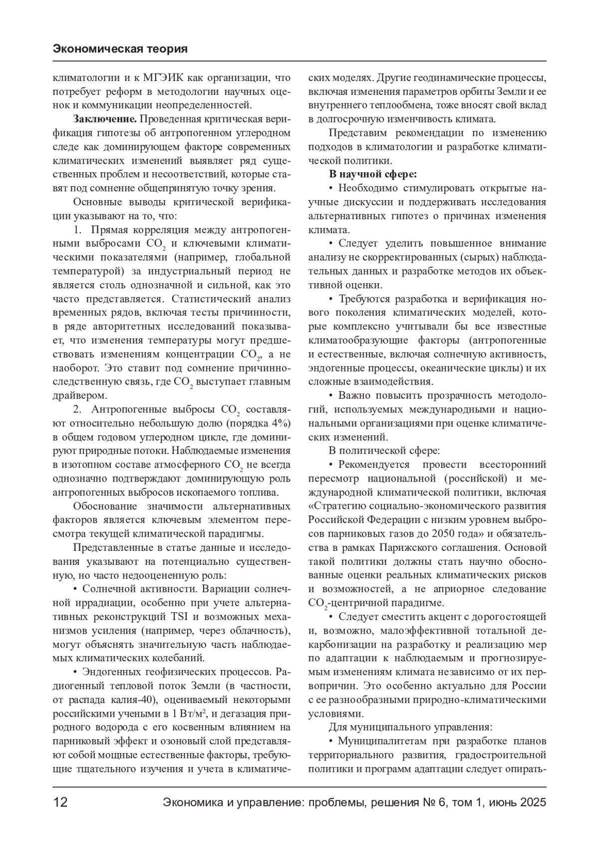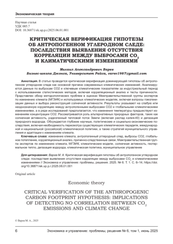 В статье проводится критическая верификация доминирующей гипотезы об антропогенном углеродном следе как основной причине современных климатических изменений. Анализируются данные по выбросам CO2 и ключевым климатическим показателям за индустриальный период с использованием статистических методов, включая корреляционный анализ и тесты причинности. Представлен обзор методологических проблем в оценках Межправительственной группы экспертов по изменению климата (МГЭИК) и используемых климатических моделях, включая вопросы гомогенизации данных и выбора реконструкций солнечной активности. Результаты указывают на слабую или неоднозначную корреляцию между антропогенными выбросами CO2 и глобальными климатическими изменениями, а в ряде исследований предполагается, что изменения температуры предшествуют изменениям концентрации CO2. Рассматривается роль альтернативных природных факторов, таких как солнечная активность, радиогенный тепловой поток Земли (включая распад калия-40) и дегазация природного водорода. Обсуждаются глубокие научные, политические и социально-экономические последствия, включая необходимость пересмотра существующих климатических парадигм, международной и национальной (российской) климатической политики, а также стратегий муниципального управления и адаптации к изменениям климата.