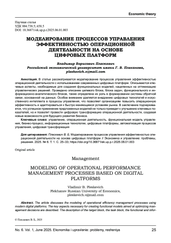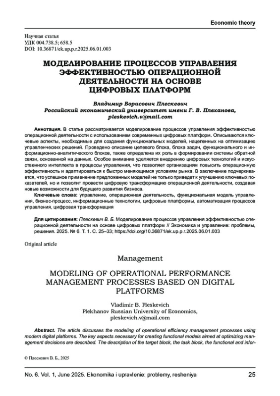 В статье рассматривается моделирование процессов управления эффективностью операционной деятельности с использованием современных цифровых платформ. Описываются ключевые аспекты, необходимые для создания функциональных моделей, нацеленных на оптимизацию управленческих решений. Проведено описание целевого блока, блока задач, функционального и информационно-аналитического блоков, также определена их роль в формировании системы обратной связи, основанной на данных. Особое внимание уделяется внедрению цифровых технологий и искусственного интеллекта в процессы управления, что позволяет организациям повысить операционную эффективность и адаптироваться к быстро меняющимся условиям рынка. В заключение подчеркивается, что успешное применение предложенных моделей не только приведет к улучшению ключевых показателей, но и позволит провести цифровую трансформацию операционной деятельности, создавая новые возможности для будущего развития бизнеса.