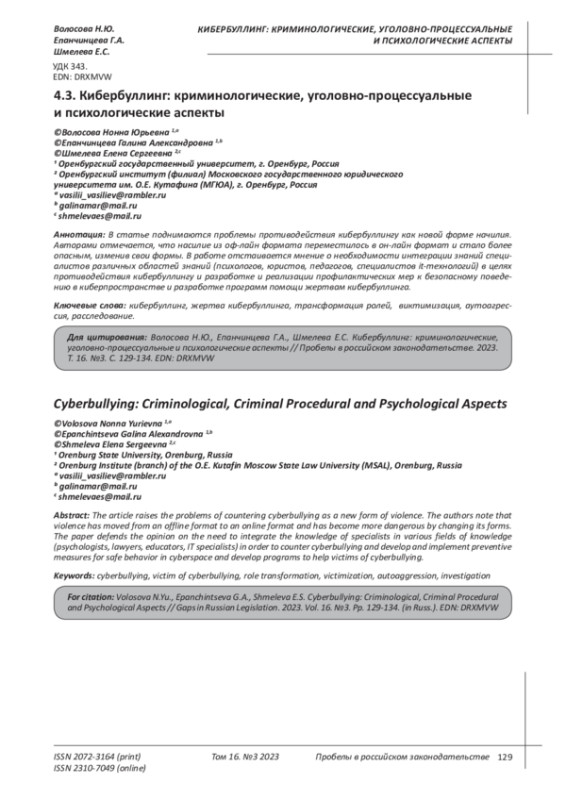 Zabelin S.E. The phenomenon of cyberbullying in the modern world / S.E. Zabelin // Substantive and procedural aspects of modern education: materials of the IV International Scientific and Practical Conference / Ed.-comp. I.A. Romanovskaya, E.A. Tarabanovskaya. - Astrakhan, 2022. - pp. 254-256. EDN: YBAUZC