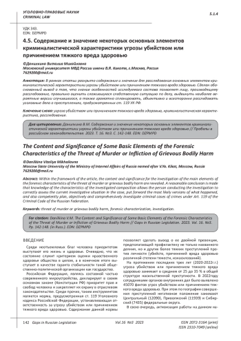 В рамках статьи раскрыто содержание и значение для расследования основных элементов криминалистической характеристики угрозы убийством или причинением тяжкого вреда здоровью. Сделан обоснованный вывод о том, что знание особенностей исследуемого состава позволяет лицу, производящему расследование, правильно оценить сложившуюся следственную ситуацию по делу, выдвинуть наиболее вероятные версии случившегося, а также грамотно спланировать, объективно и всесторонне расследовать уголовные дела о преступлениях, предусмотренных ст. 119 УК РФ.