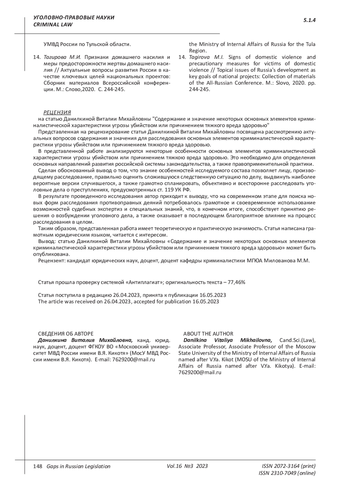 14. Тагирова М.И. Признаки домашнего насилия и меры предосторожности жертвы домашнего насилия // Актуальные вопросы развития России в качестве ключевых целей национальных проектов: Сборник материалов Всероссийской конференции. М.: Слово,2020. С. 244-245.