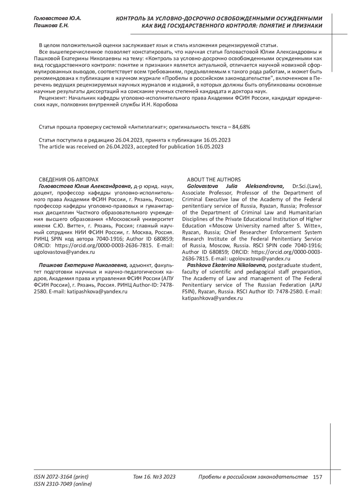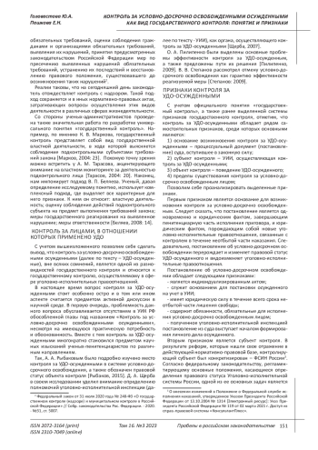 О. В. Филимонов понимает под посткриминальным контролем осуществление наблюдения за лицами, осужденными условно, с отсрочкой исполнения наказания, к ограничению по службе и к исправительным работам, подчеркивая, что данный вид контроля осуществляется не только со стороны государства, но и со стороны общественности [Филимонов, 1991: 34]. Позиция автора такова, что посткриминальный контроль – это автономная часть механизма уголовно-правового регулирования, обеспечивает экономию уголовной прогрессии. А. А. Дорожинский включает в понятие посткриминального контроля все категории лиц, состоящих на учете в УИИ, в том числе, контроль за УДО-осужденными [Дорожинский, 2021: 83]. К. В. Михайлов и вовсе отождествляет понятия посткриминального контроля и контроля за УДО-осужденными [Михайлов, 2010: 119]. На наш взгляд посткриминальный контроль не имеет ничего общего с контролем за УДО-осужденными и является больше криминологической характеристикой.