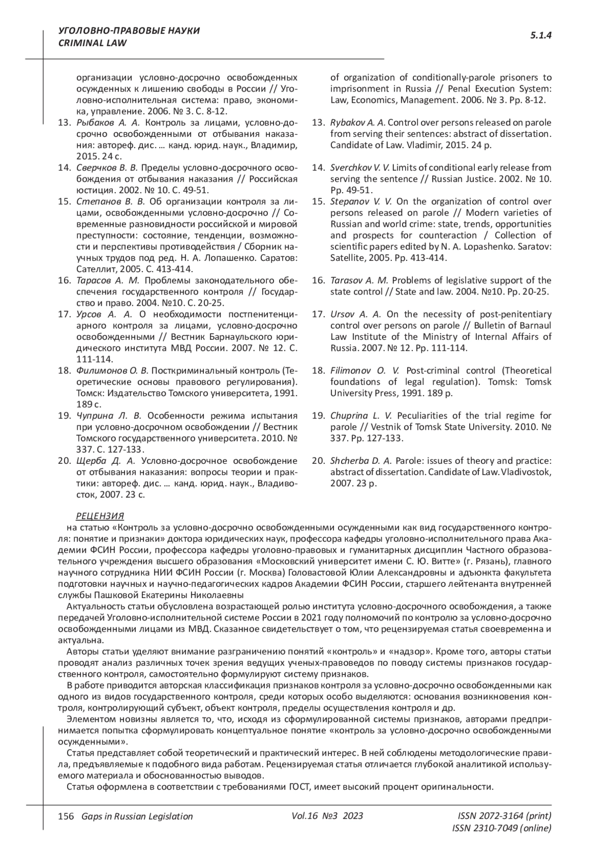 13. Рыбаков А. А. Контроль за лицами, условно-досрочно освобожденными от отбывания наказания: автореф. дис. … канд. юрид. наук., Владимир, 2015. 24 с. EDN: MQZCGR