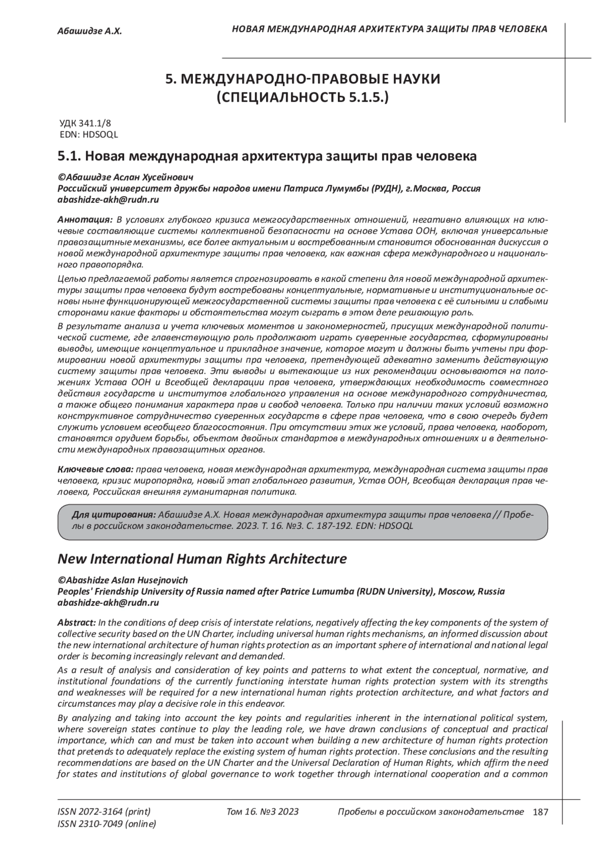 International protection of human rights: textbook / A.Kh. Abashidze, A.I. Abdullin, E.S. Alisievich [and others]; edited by A.Kh. - 2nd edition, revised and supplementary ed. - Moscow: PFUR, 2020. - 510 p.