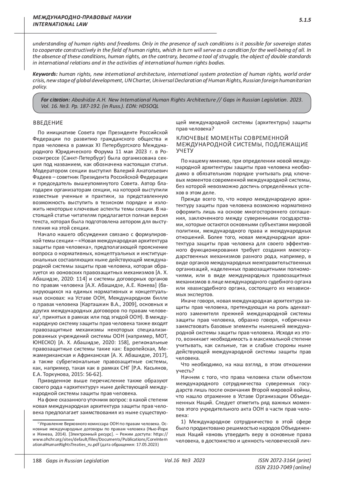 В условиях глубокого кризиса межгосударственных отношений, негативно влияющих на ключевые составляющие системы коллективной безопасности на основе Устава ООН, включая универсальные правозащитные механизмы, все более актуальным и востребованным становится обоснованная дискуссия о новой международной архитектуре защиты прав человека, как важная сфера международного и национального правопорядка. Целью предлагаемой работы является спрогнозировать в какой степени для новой международной архитектуры защиты прав человека будут востребованы концептуальные, нормативные и институциональные основы ныне функционирующей межгосударственной системы защиты прав человека с её сильными и слабыми сторонами какие факторы и обстоятельства могут сыграть в этом деле решающую роль. В результате анализа и учета ключевых моментов и закономерностей, присущих международной политической системе, где главенствующую роль продолжают играть суверенные государства, сформулированы выводы, имеющие концептуальное и прикладное значение, которое могут и должны быть учтены при формировании новой архитектуры защиты пра человека, претендующей адекватно заменить действующую систему защиты прав человека. Эти выводы и вытекающие из них рекомендации основываются на положениях Устава ООН и Всеобщей декларации прав человека, утверждающих необходимость совместного действия государств и институтов глобального управления на основе международного сотрудничества, а также общего понимания характера прав и свобод человека. Только при наличии таких условий возможно конструктивное сотрудничество суверенных государств в сфере прав человека, что в свою очередь будет служить условием всеобщего благосостояния. При отсутствии этих же условий, права человека, наоборот, становятся орудием борьбы, объектом двойных стандартов в международных отношениях и в деятельности международных правозащитных органов.
