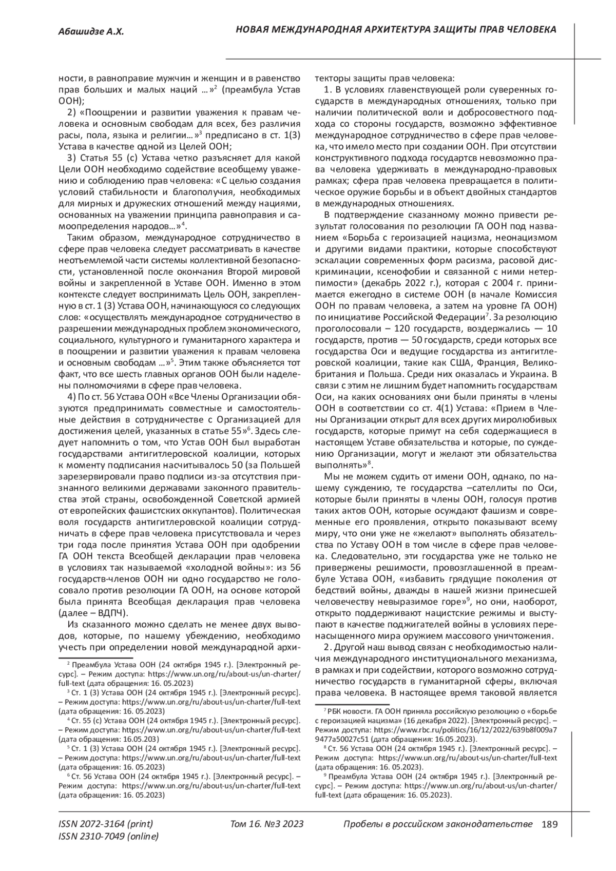 В подтверждение сказанному можно привести результат голосования по резолюции ГА ООН под названием «Борьба с героизацией нацизма, неонацизмом и другими видами практики, которые способствуют эскалации современных форм расизма, расовой дискриминации, ксенофобии и связанной с ними нетерпимости» (декабрь 2022 г.), которая с 2004 г. принимается ежегодно в системе ООН (в начале Комиссия ООН по правам человека, а затем на уровне ГА ООН) по инициативе Российской Федерации7. За резолюцию проголосовали – 120 государств, воздержались — 10 государств, против — 50 государств, среди которых все государства Оси и ведущие государства из антигитлеровской коалиции, такие как США, Франция, Великобритания и Польша. Среди них оказалась и Украина. В связи с этим не лишним будет напомнить государствам Оси, на каких основаниях они были приняты в члены ООН в соответствии со ст. 4(1) Устава: «Прием в Члены Организации открыт для всех других миролюбивых государств, которые примут на себя содержащиеся в настоящем Уставе обязательства и которые, по суждению Организации, могут и желают эти обязательства выполнять».