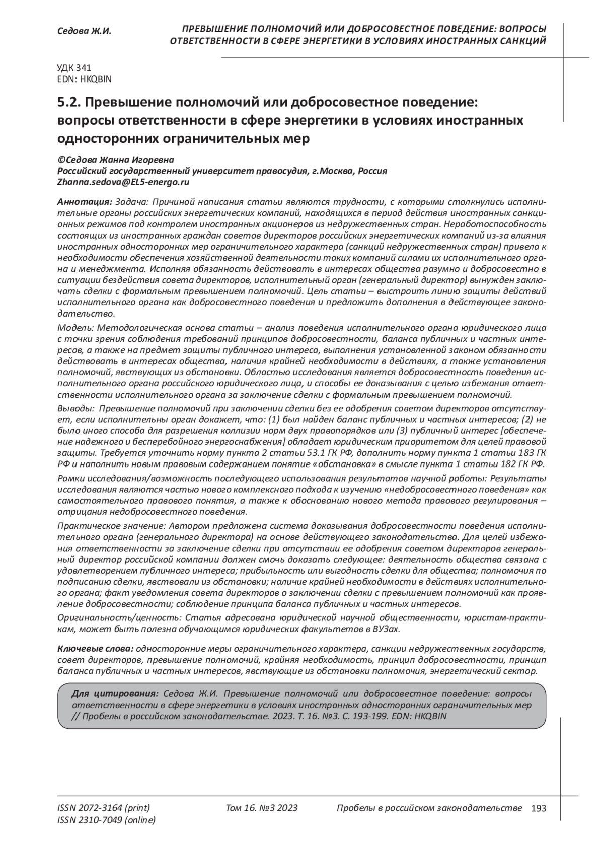 Задача: Причиной написания статьи являются трудности, с которыми столкнулись исполнительные органы российских энергетических компаний, находящихся в период действия иностранных санкционных режимов под контролем иностранных акционеров из недружественных стран. Неработоспособность состоящих из иностранных граждан советов директоров российских энергетических компаний из-за влияния иностранных односторонних мер ограничительного характера (санкций недружественных стран) привела к необходимости обеспечения хозяйственной деятельности таких компаний силами их исполнительного органа и менеджмента. Исполняя обязанность действовать в интересах общества разумно и добросовестно в ситуации бездействия совета директоров, исполнительный орган (генеральный директор) вынужден заключать сделки с формальным превышением полномочий. Цель статьи - выстроить линию защиты действий исполнительного органа как добросовестного поведения и предложить дополнения в действующее законодательство. Модель: Методологическая основа статьи - анализ поведения исполнительного органа юридического лица с точки зрения соблюдения требований принципов добросовестности, баланса публичных и частных интересов, а также на предмет защиты публичного интереса, выполнения установленной законом обязанности действовать в интересах общества, наличия крайней необходимости в действиях, а также установления полномочий, явствующих из обстановки. Областью исследования является добросовестность поведения исполнительного органа российского юридического лица, и способы ее доказывания с целью избежания ответственности исполнительного органа за заключение сделки с формальным превышением полномочий. Выводы: Превышение полномочий при заключении сделки без ее одобрения советом директоров отсутствует, если исполнительны орган докажет, что: (1) был найден баланс публичных и частных интересов; (2) не было иного способа для разрешения коллизии норм двух правопорядков или (3) публичный интерес [обеспечение надежного и бесперебойного энергоснабжения] обладает юридическим приоритетом для целей правовой защиты. Требуется уточнить норму пункта 2 статьи 53.1 ГК РФ, дополнить норму пункта 1 статьи 183 ГК РФ и наполнить новым правовым содержанием понятие «обстановка» в смысле пункта 1 статьи 182 ГК РФ. Рамки исследования/возможность последующего использования результатов научной работы: Результаты исследования являются частью нового комплексного подхода к изучению «недобросовестного поведения» как самостоятельного правового понятия, а также к обоснованию нового метода правового регулирования - отрицания недобросовестного поведения. Практическое значение: Автором предложена система доказывания добросовестности поведения исполнительного органа (генерального директора) на основе действующего законодательства. Для целей избежания ответственности за заключение сделки при отсутствии ее одобрения советом директоров генеральный директор российской компании должен смочь доказать следующее: деятельность общества связана с удовлетворением публичного интереса; прибыльность или выгодность сделки для общества; полномочия по подписанию сделки, явствовали из обстановки; наличие крайней необходимости в действиях исполнительного органа; факт уведомления совет