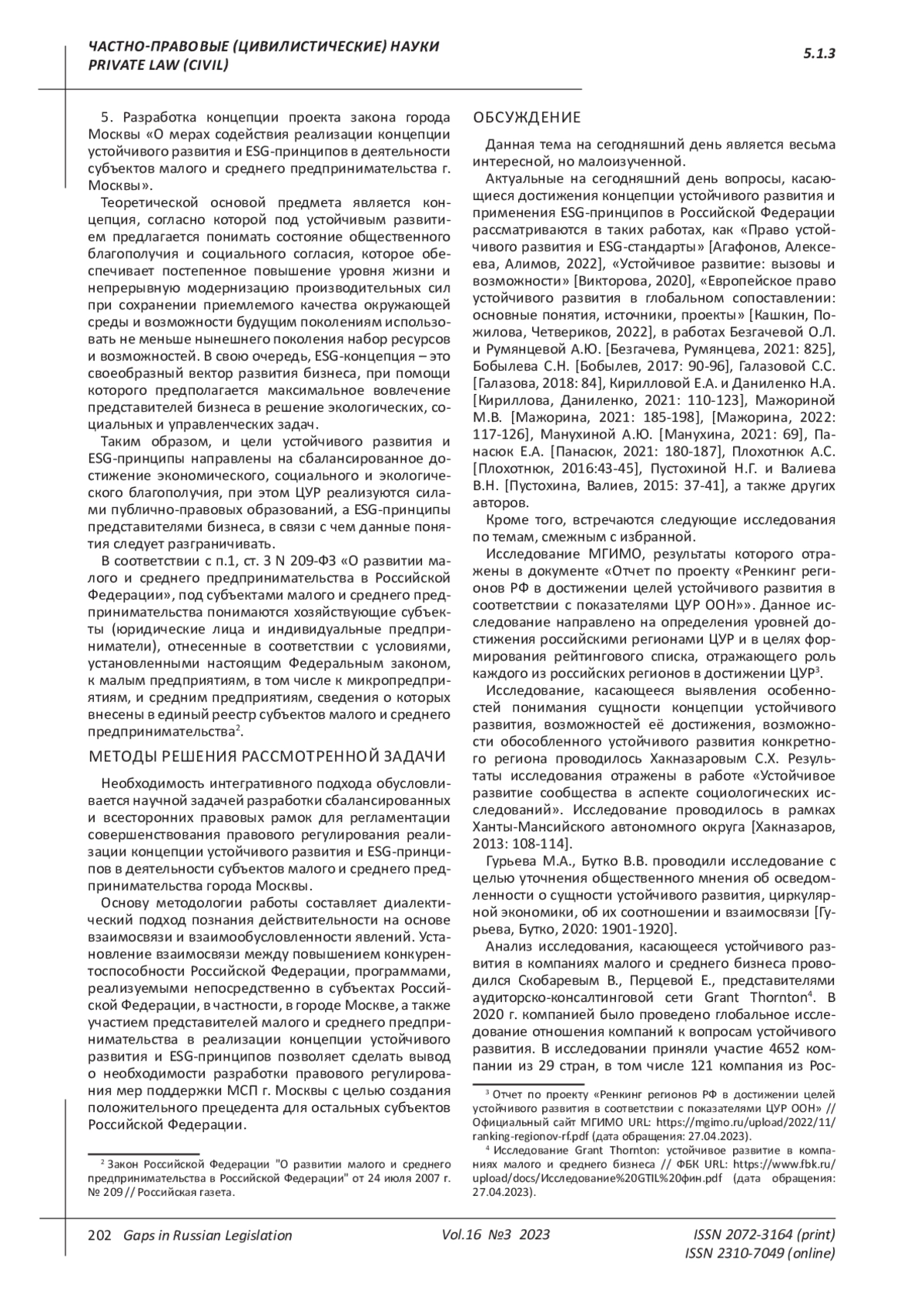 Целью работы является анализ проведенного социологического исследования, посвященного выявлению особенностей понимания и восприятия концепции устойчивого развития и ESG-принципов представителями малого и среднего предпринимательства (МСП) города Москвы, определению степени их готовности принимать участие в реализации концепции устойчивого развития и ESG-принципов в рамках своей деятельности, а также разработка концептуальных подходов к совершенствованию правового регулирования реализации концепции устойчивого развития и ESG-принципов в деятельности субъектов малого и среднего предпринимательства города Москвы. Проведенное социологическое исследование показало то, что опрошенные представители МСП города Москвы ассоциируют действия по реализации концепции устойчивого развития и ESG-принципов с государственными инициативами, при этом выражают готовность принимать участие в подобного рода проектах, при условии, если со стороны государства, органов муниципальной власти будут предложены меры поддержки, например, в виде налоговых льгот. Кроме того, в результате проведенного исследования сделан вывод о целесообразности разработки концепции проекта закона города Москвы «О мерах содействия реализации концепции устойчивого развития и ESG-принципов в деятельности субъектов малого и среднего предпринимательства г. Москвы», а также сформулированы отдельные положения концепции проекта закона.
