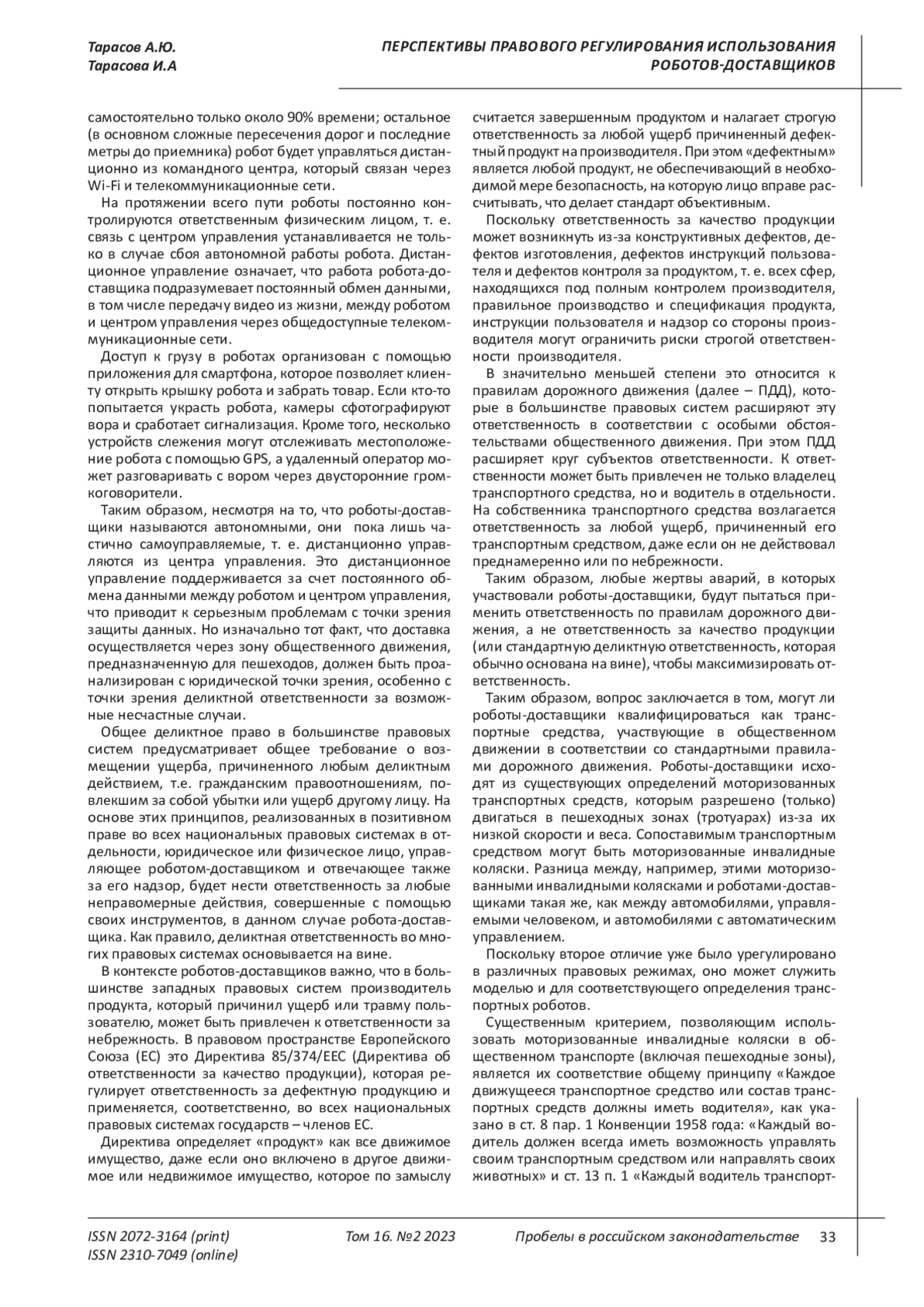 Целью статьи является изучение недостатков нормативно-правовой базы использования специфических автономных транспортных средств (роботов-доставщиков), несмотря на зрелость лежащей в их основе технологии. В качестве объекта исследования выступают общественные отношения в сфере обеспечения безопасности дорожного движения, связанные с разработкой и эксплуатацией роботов-доставщиков с автономным управлением. При этом предметом исследования являются нормативные правовые акты, лежащие в основе разработки и функционирования автономных беспилотных роботов. В рамках методологии исследования с использованием сравнительно-правового метода осуществлен анализ основных этапов развития и становления технологий использования роботов-доставщиков. Особое внимание уделено изучению различных исследований по определению основных преимуществ использования автономных беспилотных роботов. Роботы-доставщики с автономным управлением разрабатываются во всем мире, и первые прототипы тестируются уже в России. Автоматические доставщики также используются в Германии, Великобритании и Соединенных Штатов Америки (США), где они обеспечивают многообещающее решение проблемы непосредственной доставки потребителю товаров, которую принято называть доставкой «последней мили». Связанные с этим вопросы регулирования простираются от защиты данных и ответственности за совершение правонарушений до таких обыденных областей, как правила дорожного движения, которые должен учитывать поставщик логистических услуг.