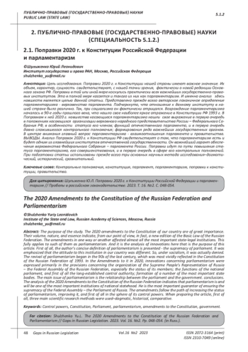Цель исследования. Поправки 2020 г. к Конституции нашей страны имеют важное значение. Их объем, характер, сущность свидетельствуют, с нашей точки зрения, фактически о новой редакции Основного закона РФ. Поправки в той или иной мере коснулись практически всех важнейших государственно-правовых институтов. Это в полной мере касается и такого из них как парламентаризм. И именно анализ здесь новшеств является целью данной статьи. Представлено прежде всего авторское лаконичное определение парламентаризма - верховенство парламента. Подчеркнуто, что отношение к данному институту в нашей стране было различно. Так, при социализма он фактически отрицался. Возрождение парламентаризма началось в 90-е годы прошлого века, что нашло свое наиболее яркое отражение в Конституции РФ 1993 г. В Поправкам к ней 2020 г. новшества касающиеся парламентаризма нашли свое выражение в первую очередь в положениях касающихся организации верховного народного представительства России - Федерального Собрания РФ, в особенности статуса его членов; функций отечественного парламента, и в первую очередь давно сложившегося контрольного полномочия; формирования ряда важнейших государственных органов. В центре внимания главный вопрос парламентаризма - взаимоотношения парламента и правительства. ВЫВОДЫ. Анализ Поправок 2020 г. к Конституции РФ свидетельствует о том, что парламентаризм есть и будет одним из главнейших институтов отечественной государственности. Он важнейший гарант обеспечения верховенства Федерального Собрания - парламента России. Поправки идут по пути повышения статуса парламентаризма, его совершенствования, и в первую очередь в сфере его контрольных полномочий. При подготовки статьи использованы прежде всего три основных научных метода исследования-догматический, исторический, сравнительный.