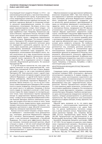 Существенные новшества связаны и с парламентаризмом, такого с одной стороны самостоятельного института, а с другой, важнейшей составной ряда иных фундаментальных институтов, показателей прогрессивного общества, как например, правовое государство, конституционализм. Прежде чем перейти к анализу данных новшеств, обратимся кратко к ряду отправных позиций. В первую очередь о самом понятии, определении «парламентаризм». Особо подчеркнем, что в этом плане российская наука всегда превосходила и превосходит все остальные, зарубежные. Представлено большое число отечественных определений данного феномена в различные годы на основе самых различных критериев. В дореволюционной России здесь был самым плодотворным период конституционной монархии. Свои позиции высказали практически все известные отечественные ученые- юристы того времени. Например, Н. И. Лазаревский, С. А. Корф, Н. К. Соколов [Лазаревский, 1913: 667; Корф, 1915: 299; Соколов, 1912: 7]. В центре здесь было взаимоотношение парламента и исполнительной власти, зависимость последней от доверия первой.