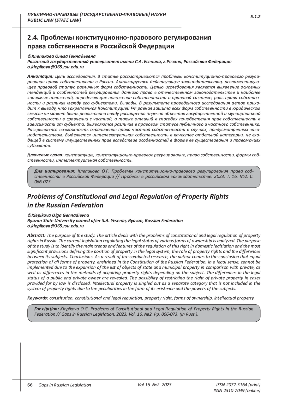 Saurin A.A. Property rights in the Russian Federation: constitutional and legal limits of implementation and restrictions: Diss… doct. jurid. Sciences. M. 2014. - 400 p. EDN: SPKVVD