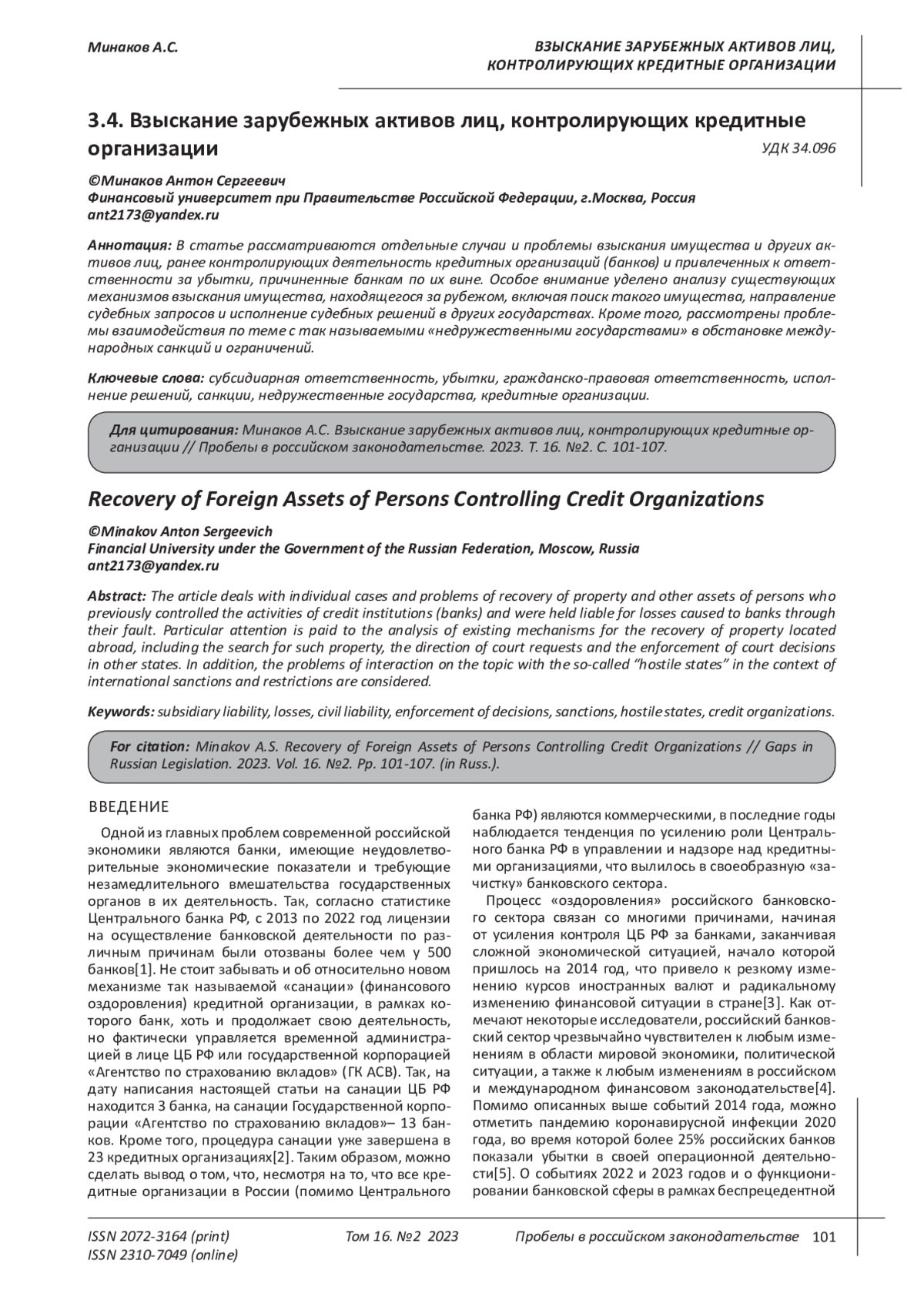 В статье рассматриваются отдельные случаи и проблемы взыскания имущества и других активов лиц, ранее контролирующих деятельность кредитных организаций (банков) и привлеченных к ответственности за убытки, причиненные банкам по их вине. Особое внимание уделено анализу существующих механизмов взыскания имущества, находящегося за рубежом, включая поиск такого имущества, направление судебных запросов и исполнение судебных решений в других государствах. Кроме того, рассмотрены проблемы взаимодействия по теме с так называемыми «недружественными государствами» в обстановке международных санкций и ограничений.