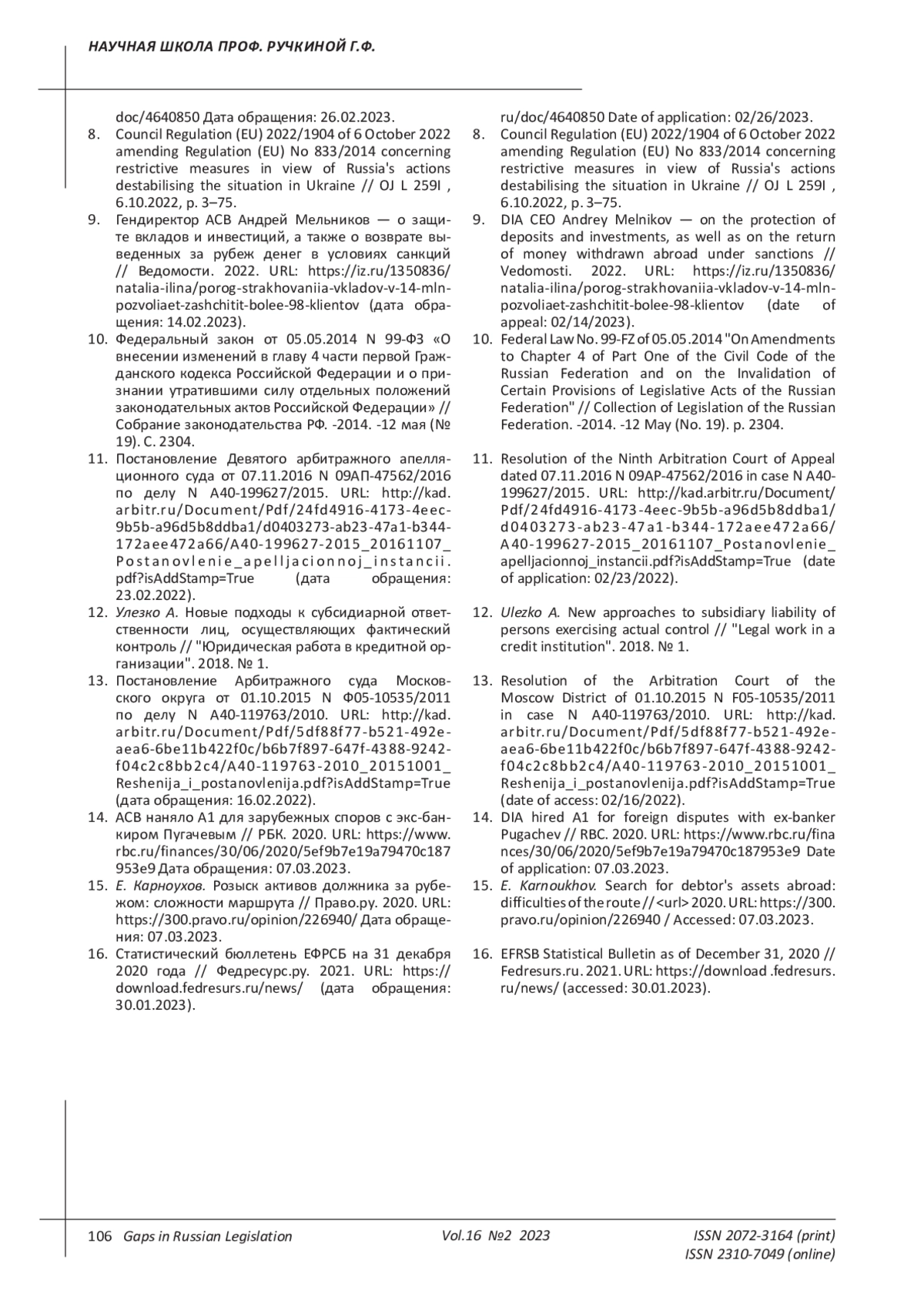 15. Е. Карноухов. Розыск активов должника за рубежом: сложности маршрута // Право.ру. 2020. URL: https://300.pravo.ru/opinion/226940/ Дата обращения: 07.03.2023.