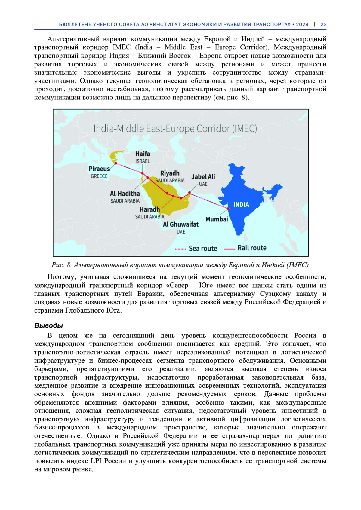 В статье рассмотрены перспективы развития транспортно-логистического комплекса Российской Федерации с позиции оценки уровня конкурентоспособности возможностей транспортной инфраструктуры и ее интеграции в международную транспортную систему. Россия как один из крупнейших экономических и геополитических участников международного сообщества играет стратегическую роль в этой системе. Оценка ее конкурентоспособности в международном транспортном сообщении представляет собой сложную задачу, включающую в себя анализ различных аспектов, таких как инфраструктура, эффективность логистики, доступность рынков и тарифные политики.