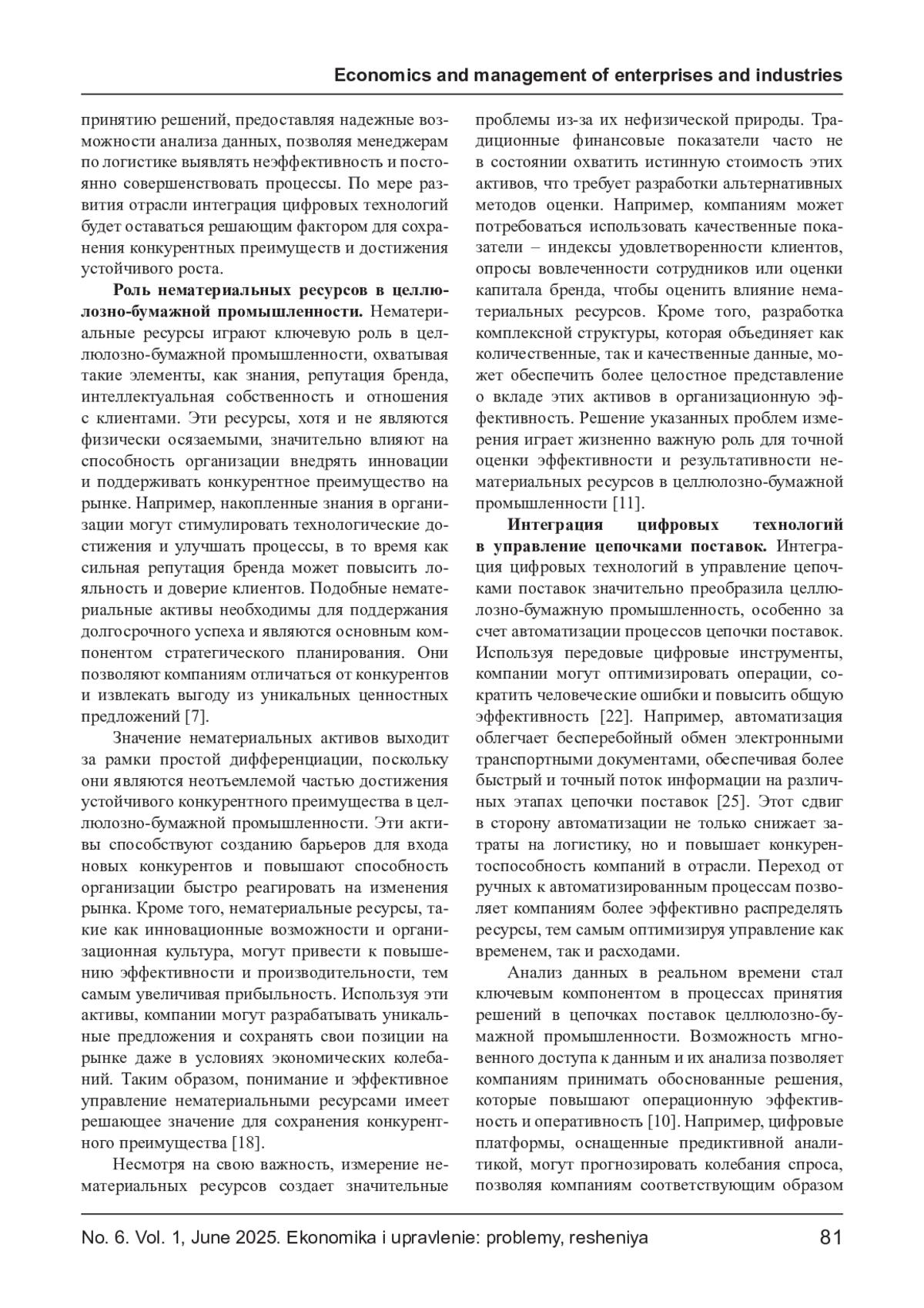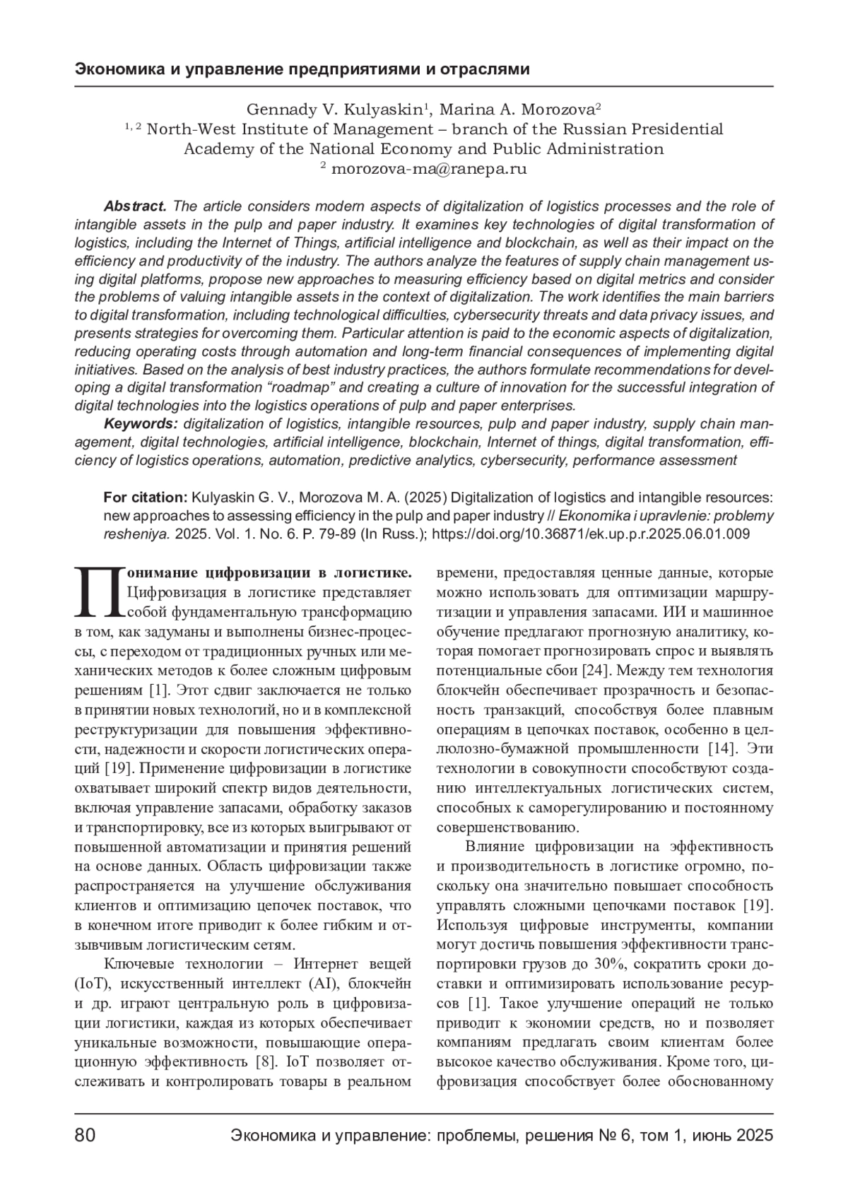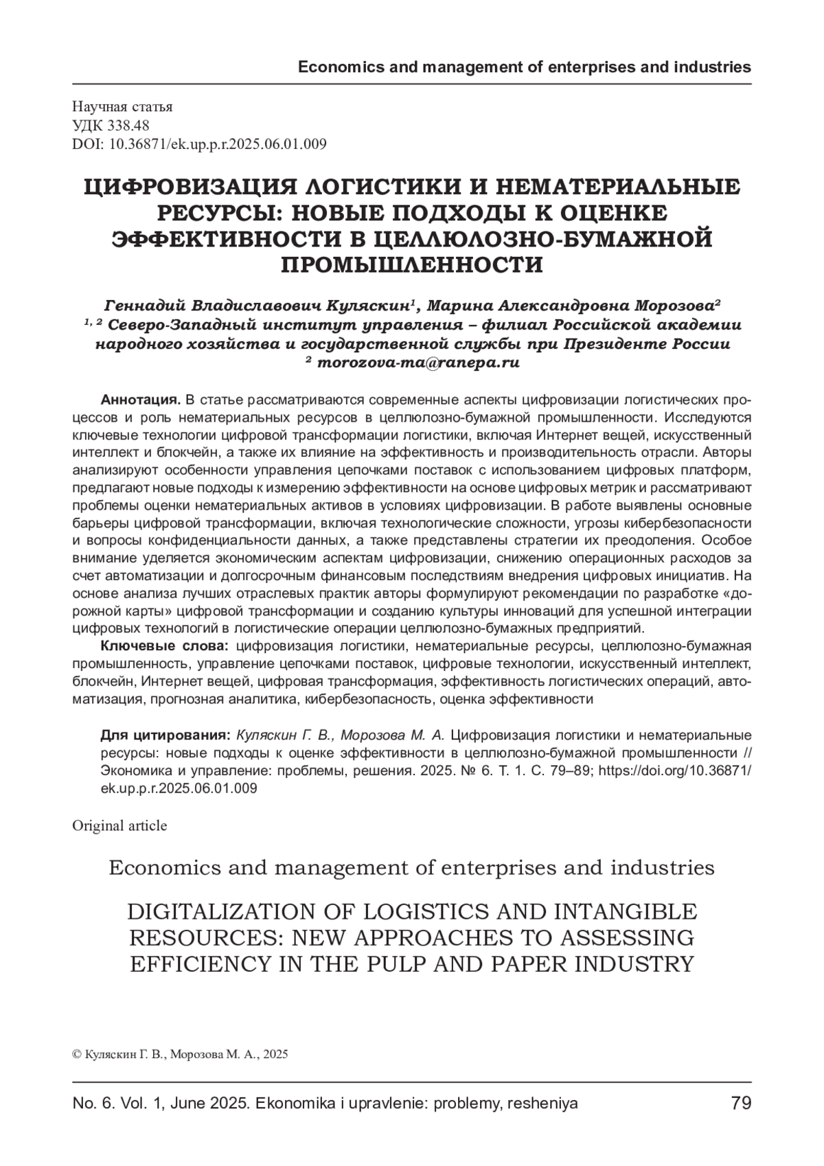 В статье рассматриваются современные аспекты цифровизации логистических процессов и роль нематериальных ресурсов в целлюлозно-бумажной промышленности. Исследуются ключевые технологии цифровой трансформации логистики, включая Интернет вещей, искусственный интеллект и блокчейн, а также их влияние на эффективность и производительность отрасли. Авторы анализируют особенности управления цепочками поставок с использованием цифровых платформ, предлагают новые подходы к измерению эффективности на основе цифровых метрик и рассматривают проблемы оценки нематериальных активов в условиях цифровизации. В работе выявлены основные барьеры цифровой трансформации, включая технологические сложности, угрозы кибербезопасности и вопросы конфиденциальности данных, а также представлены стратегии их преодоления. Особое внимание уделяется экономическим аспектам цифровизации, снижению операционных расходов за счет автоматизации и долгосрочным финансовым последствиям внедрения цифровых инициатив. На основе анализа лучших отраслевых практик авторы формулируют рекомендации по разработке «дорожной карты» цифровой трансформации и созданию культуры инноваций для успешной интеграции цифровых технологий в логистические операции целлюлозно-бумажных предприятий.