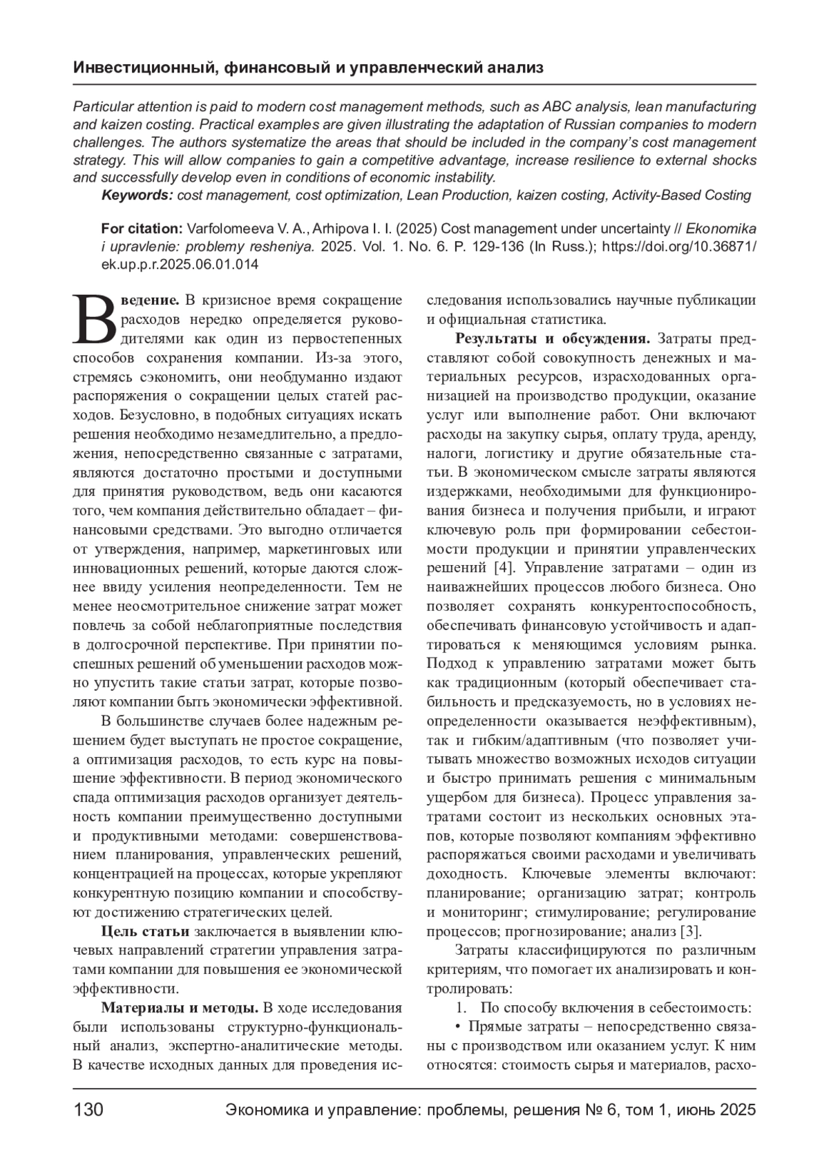 3. Григорян Ю. А. Аналитический обзор методов управления затратами и себестоимостью продукции организации // Экономика и бизнес: теория и практика. 2020. № 2-1 (60). С. 71-74. EDN: WMQPNF