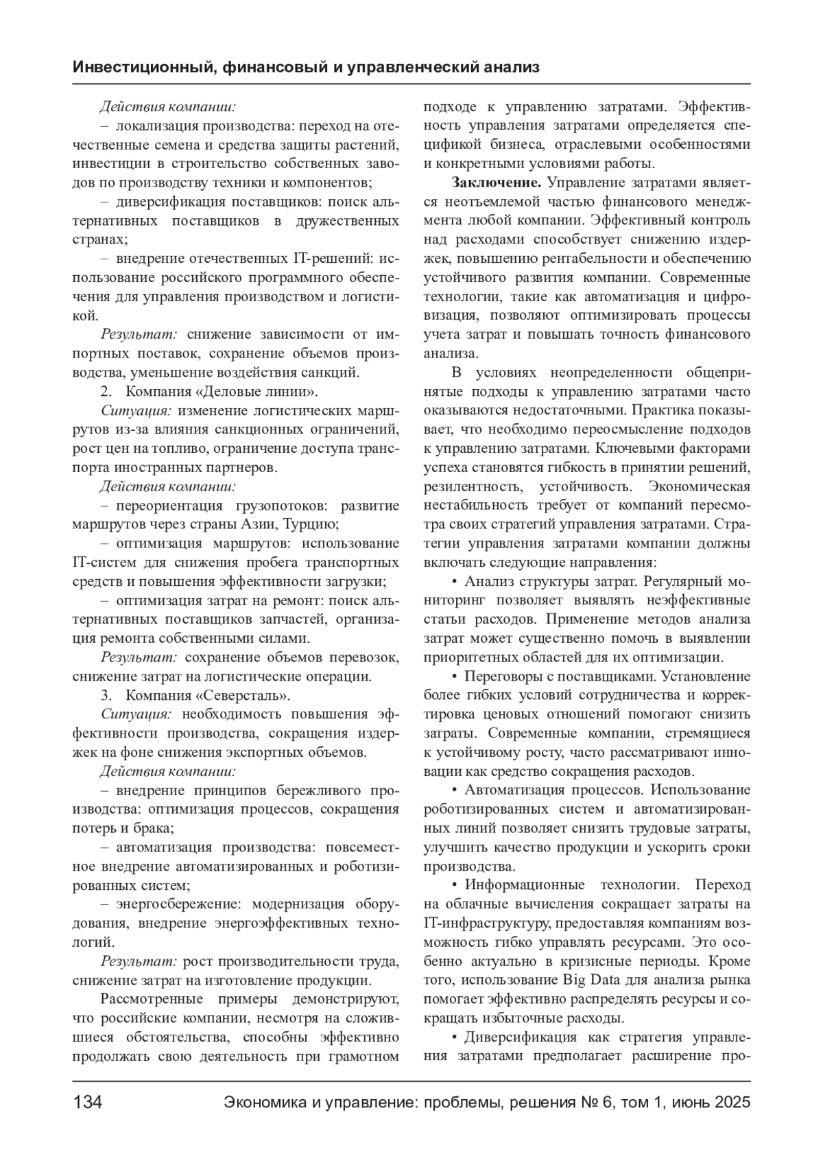 В условиях растущей нестабильности глобальной экономической и политической среды эффективное управление затратами становится главным фактором успешного развития компании. Авторы настоящей статьи отмечают, что современные цифровые решения позволяют детально анализировать структуру затрат, выявлять скрытые расходы и предлагать пути их оптимизации. В статье указаны преимущества и недостатки влияния автоматизации процессов, а также цифровизации данных на управление затратами компаний. Особое внимание уделено современным методам управления затратами, таким как АВС-анализ, бережливое производство и кайзен-костинг. Приведены практические примеры, иллюстрирующие адаптацию российских компаний к современным вызовам. Авторы систематизируют направления, которые должны быть включены в стратегию управления затратами компании. Это позволит компаниям получить конкурентное преимущество, повысить устойчивость к внешним шокам и успешно развиваться даже в условиях экономической нестабильности.