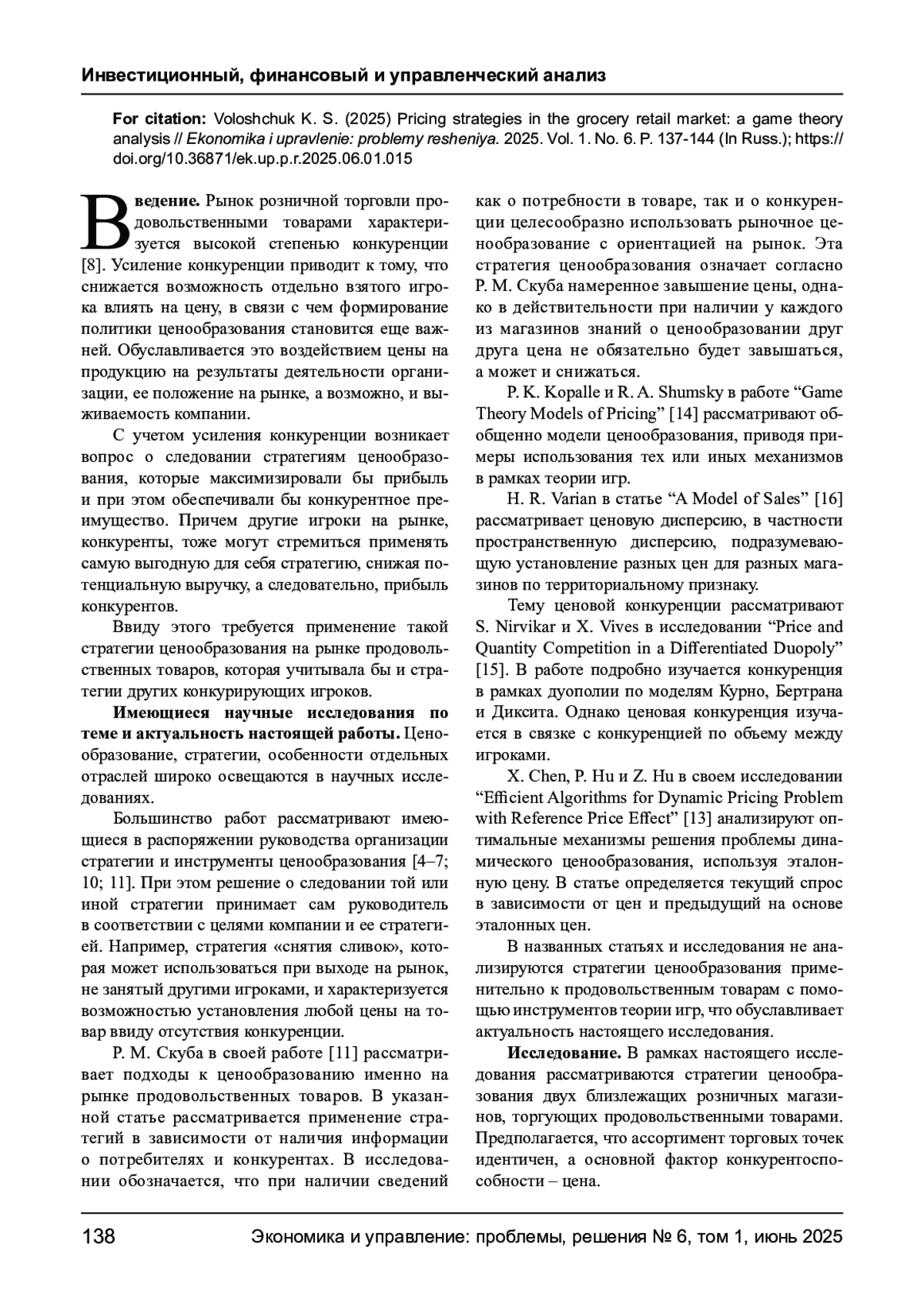 11. Скуба Р. М. Стратегические подходы ценообразования на рынках продовольственных товаров // International agricultural journal. 2021. № 3. С. 157-169. URL: https://cyberleninka.ru/article/n/strategicheskie-podhody-tsenoobrazovaniya-na-rynkah-prodovolstvennyh-tovarov.