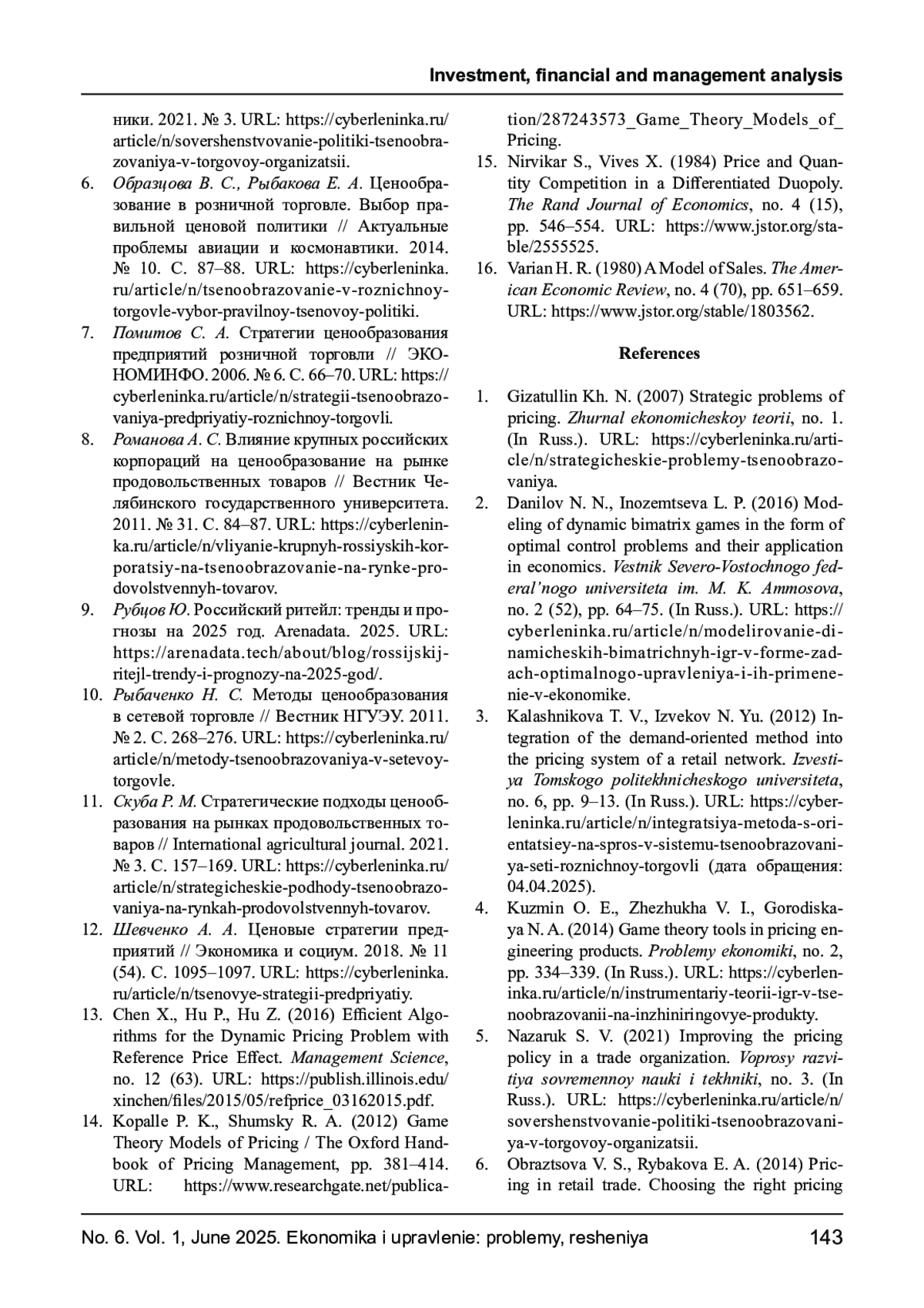 3. Калашникова Т. В., Извеков Н. Ю. Интеграция метода с ориентацией на спрос в систему ценообразования сети розничной торговли // Известия Томского политехнического университета. 2012. № 6. С. 9-13. URL: https://cyberleninka.ru/article/n/integratsiya-metoda-s-orientatsiey-na-spros-v-sistemu-tsenoobrazovaniya-seti-roznichnoy-torgovli.