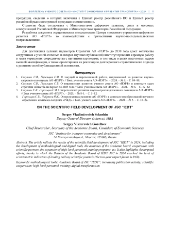 В статье отражены результаты развития научной сферы АО «ИЭРТ» в 2024 г., включая развитие методического и цифрового инструментария, деятельности ученого совета, сотрудничества с научными партнерами, расширение направлений подготовки кадров высшей квалификации и др. Освещена целенаправленная работа, благодаря которой корпоративное издание «Бюллетень ученого совета АО «ИЭРТ» в 2024 г. достигло уровня наукометрических показателей ведущих отраслевых научных журналов (двухлетний импакт-фактор составил 0,69).